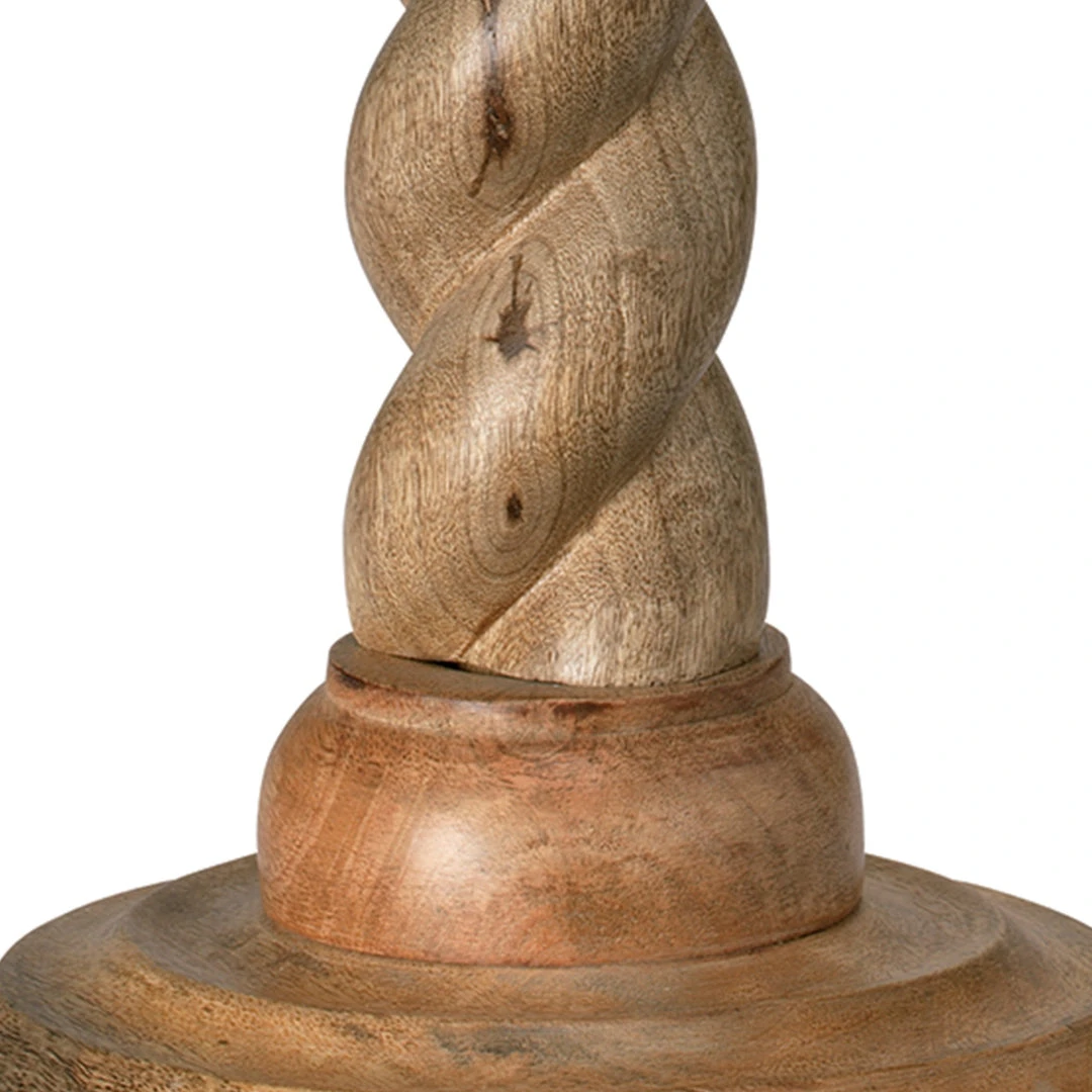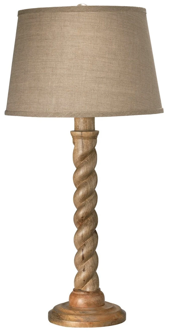 This traditional table lamp features a twisted natural wood base complemented by a stone linen drum shade. From Jamie Young.