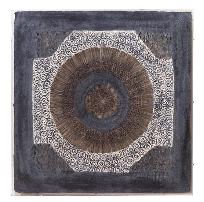 Batik dyed paper in intricate patterns are placed behind acrylic to create this immersive piece of wall art. Using different techniques to create patterns of blue and white print and deep indigo dyed woven paper, this art piece will mesmerize any onlooker.
