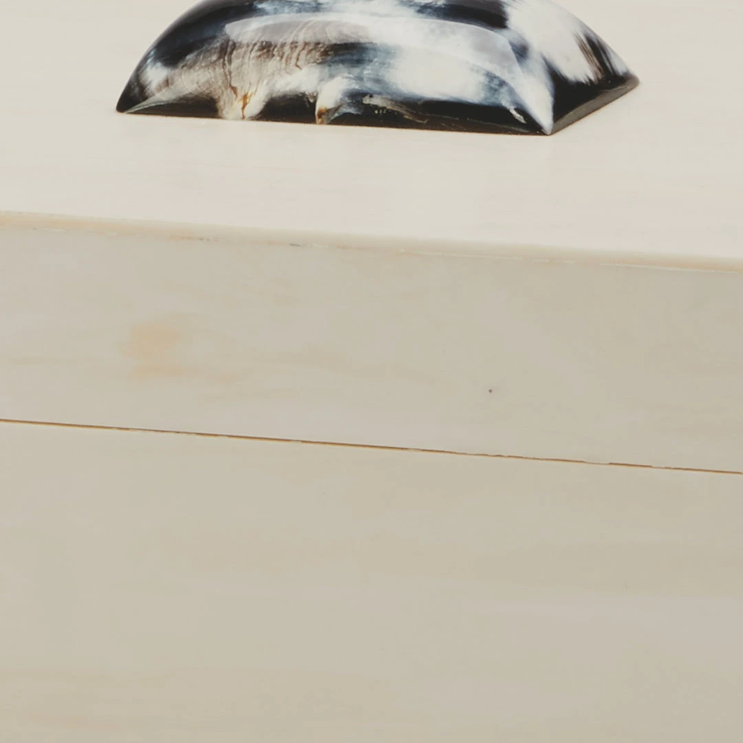 This sophisticated box in clean, cream resin is delicately accented with the perfect horn accent. This refined design shows restraint making it an elegant addition to your coffee table.