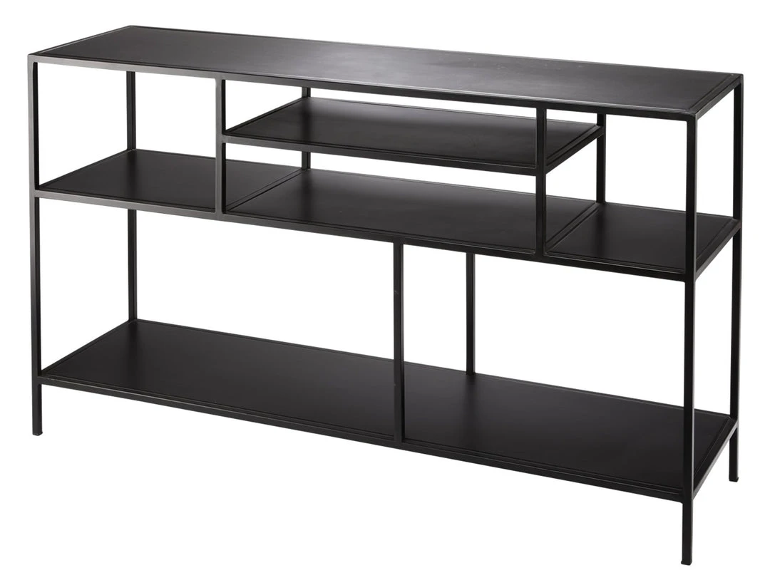 Black metal shelves and supports are asymmetrically arranged to create the perfect console or open-work media cabinet. The extra storage is great for displaying curated accessories or audio/visual necessities.