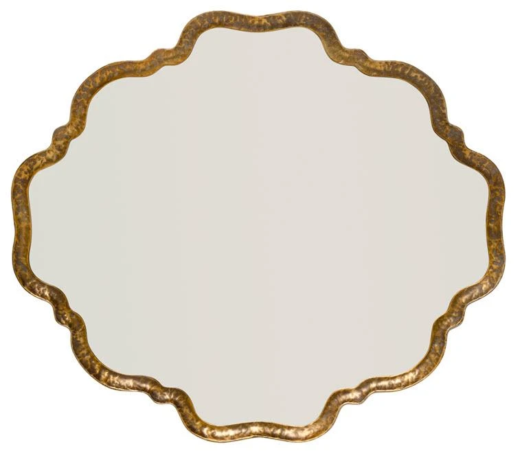 This mirror hangs both vertically and horizontally. Antique gold and scalloped edges, this beautiful piece is a mix of unique design, yet versatile for most spaces.