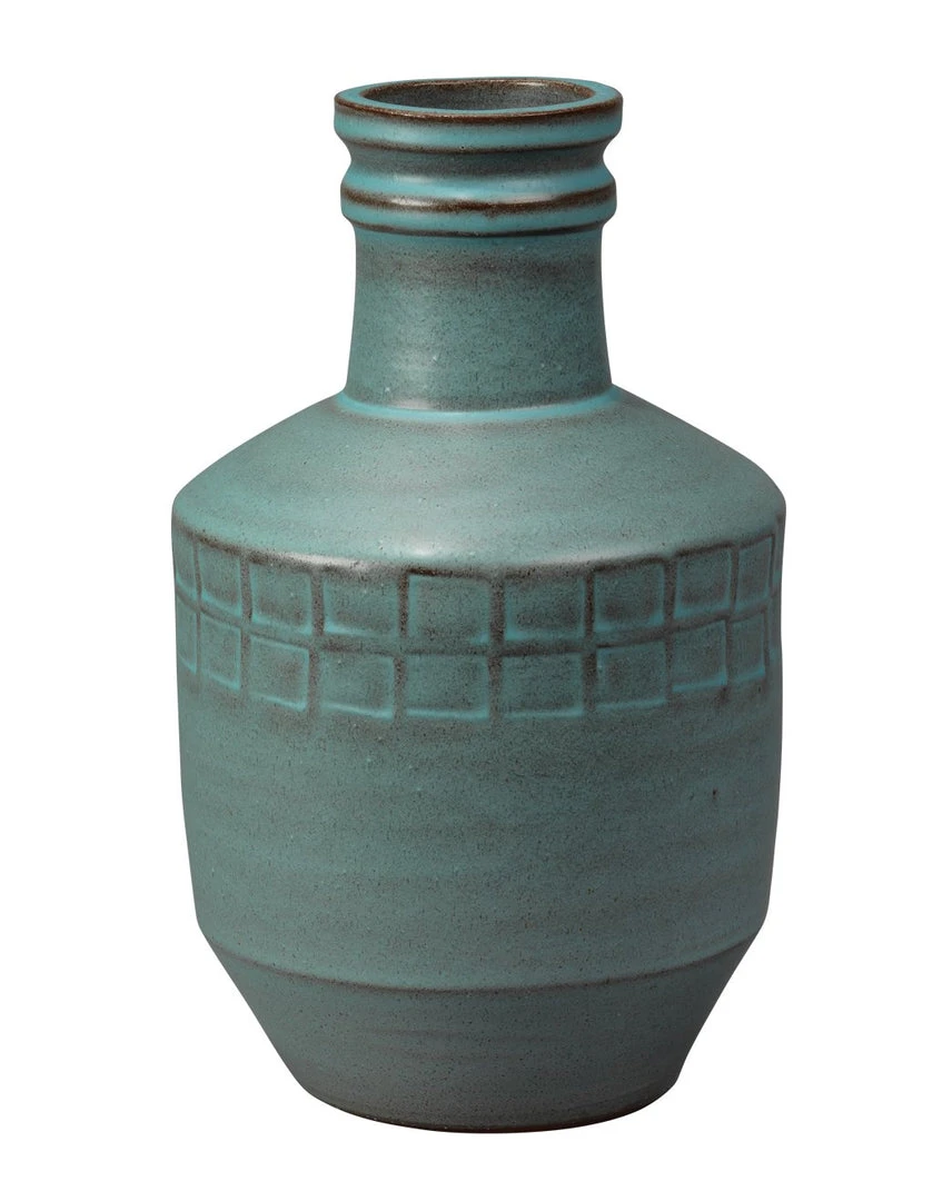 This artful handmade ceramic vase features a recessed organic forms banding and a distinctive shape. The soft toned glaze partners well with many interior color schemes.