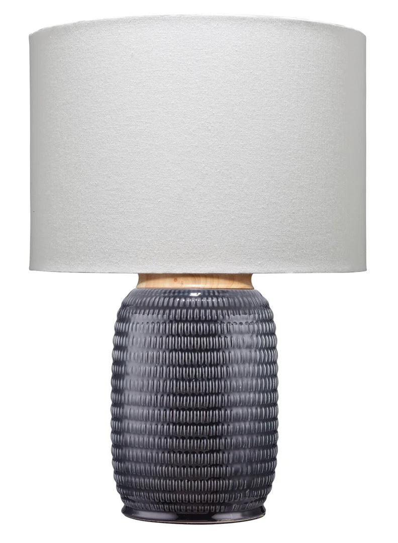 The detailed surface of this table lamp and the ceramic glaze, gives this piece a contemporary and worldly feel. Finial and harp included. Lamp and lamp shade included.