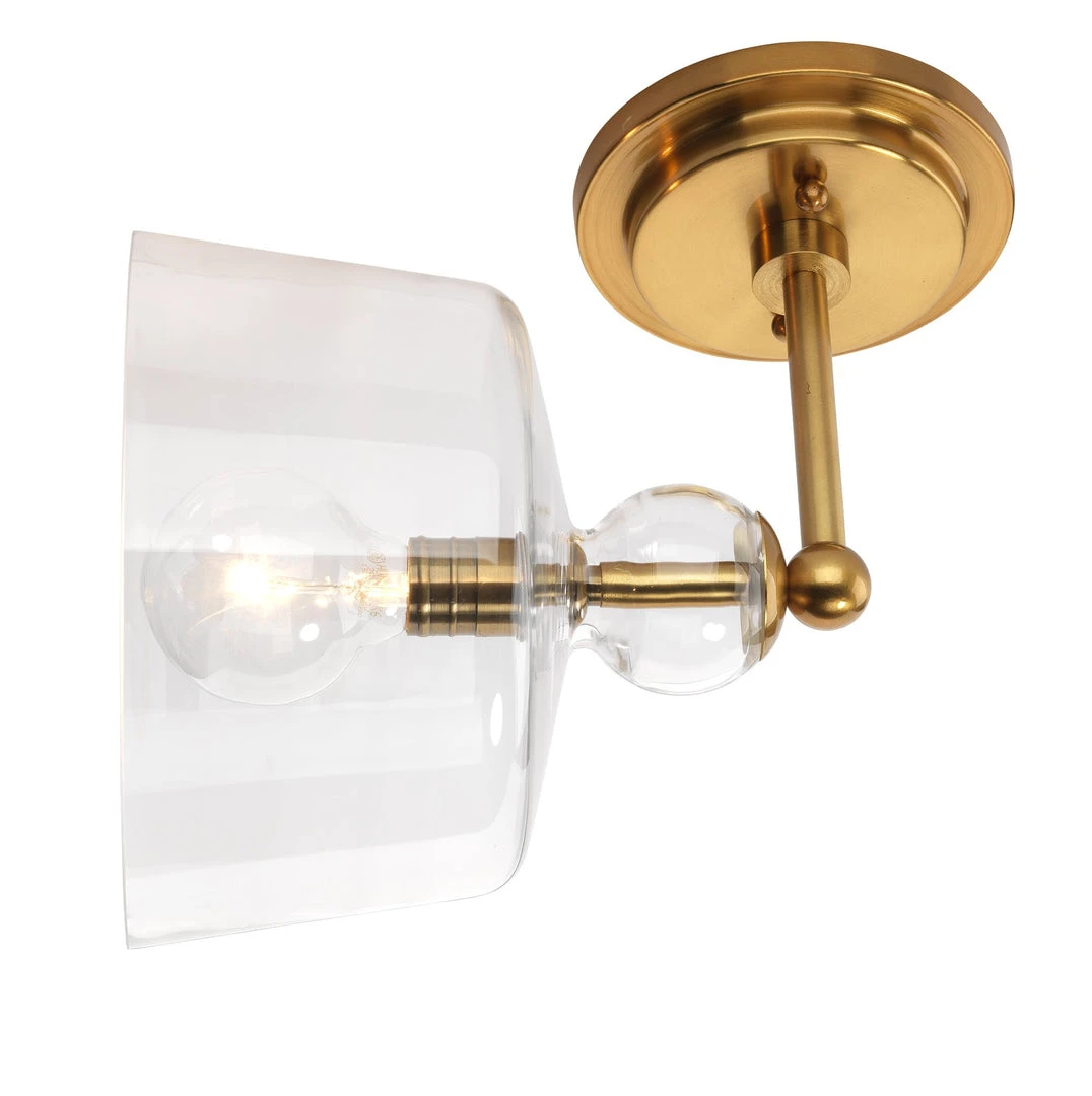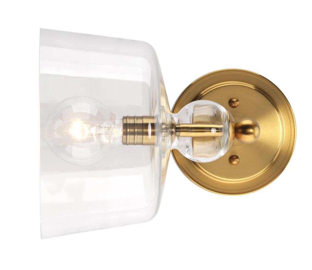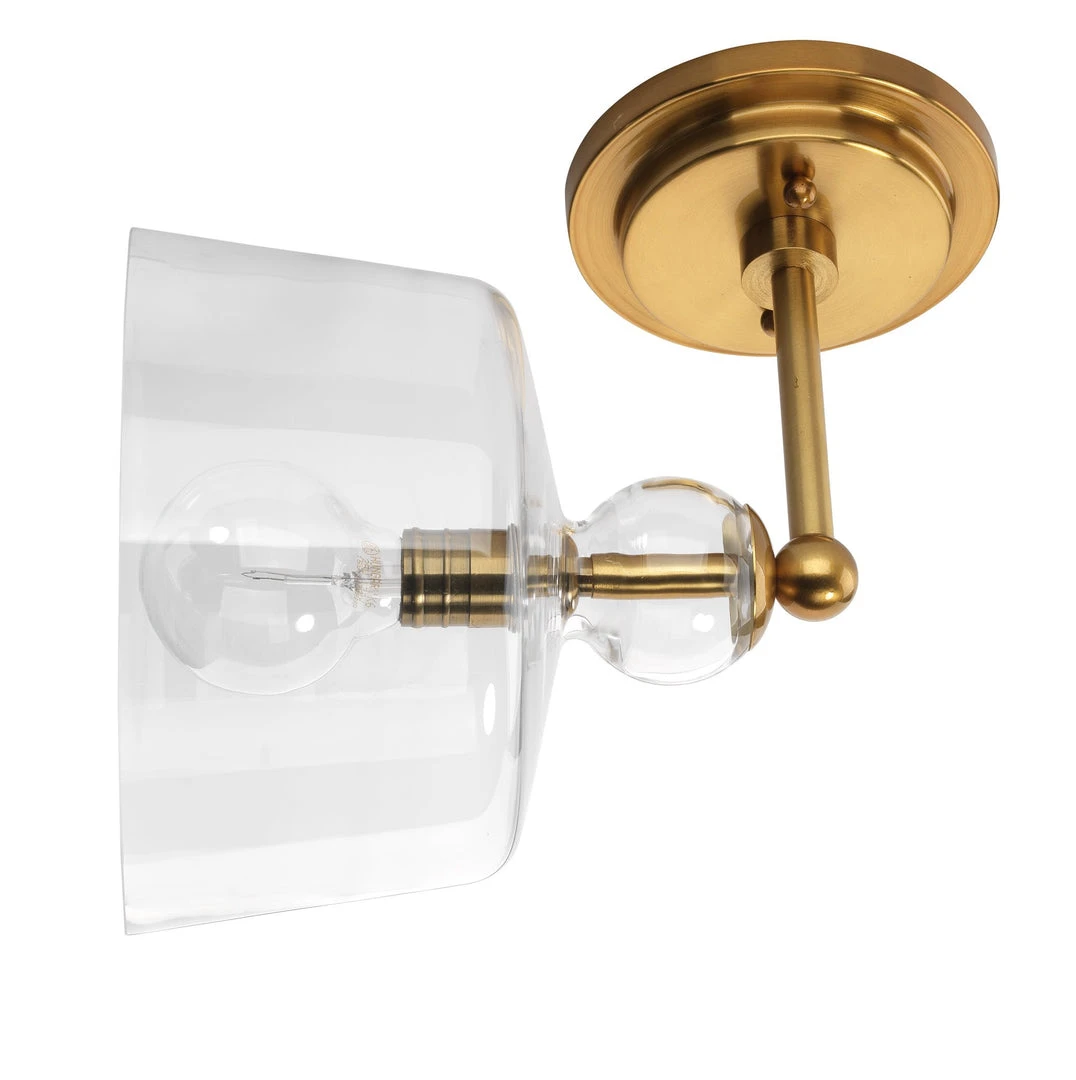 Expert hand-craftmanship elevates the straightforward lines of this metal and glass wall sconce. The plate and arm are iron, and available in antiqued brass or matte black finishes. Due to the artisan crafted nature of these finishes, they may vary slightly from pictured. They may be installed as shown or can be inversed, and all mounting hardware is included.