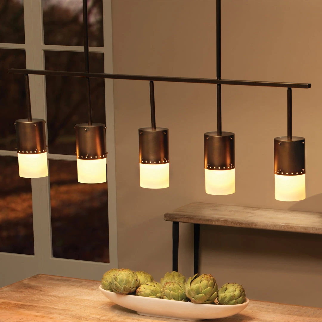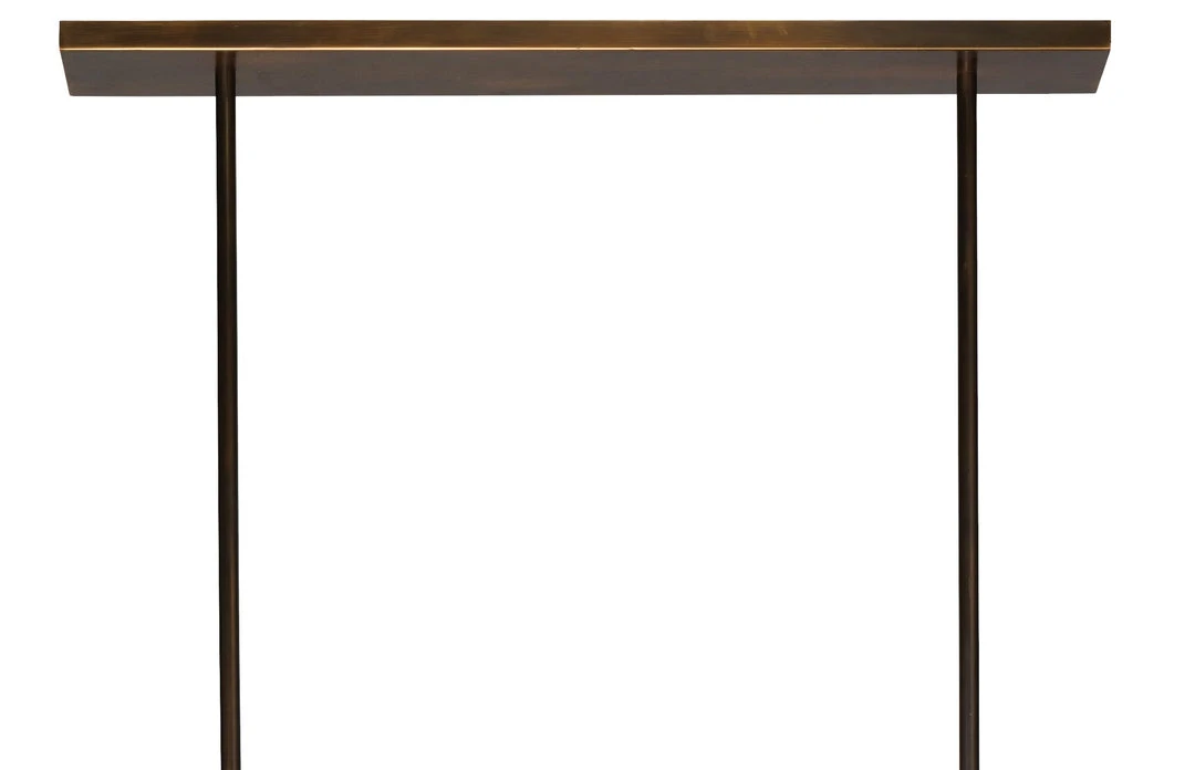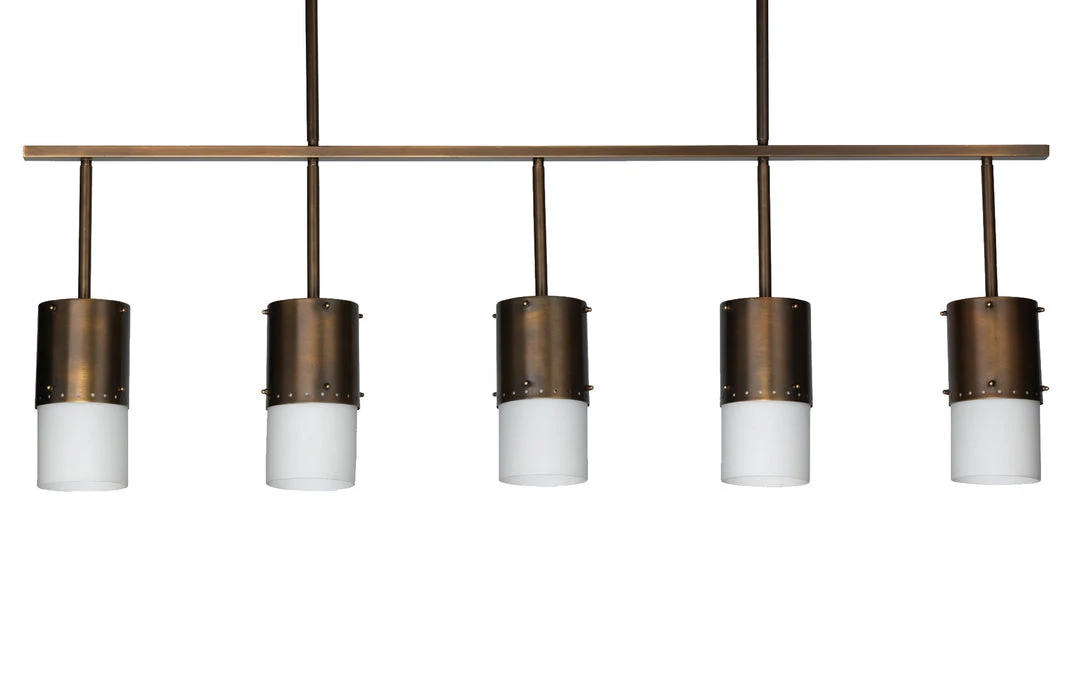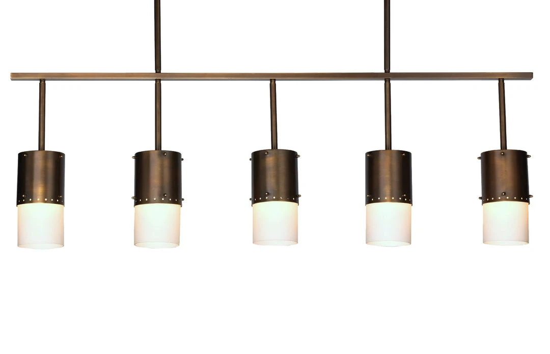 The Lazio chandelier is the perfect length at 50″ wide to hang over a long dining table or pool table. With a beautiful light oil bronzed patina and white glass shades