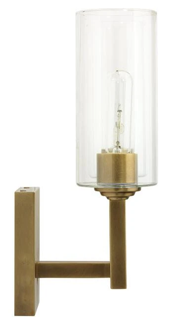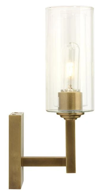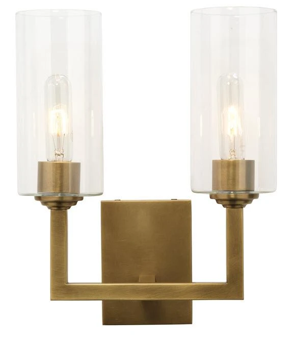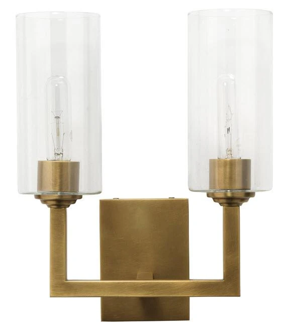 The modern, stylish angles of the Linear Double Wall Sconce is highlighted by the warm antique brass finish. This fixture modernizes the classic vintage torchier with clear glass shades in an elegant design.