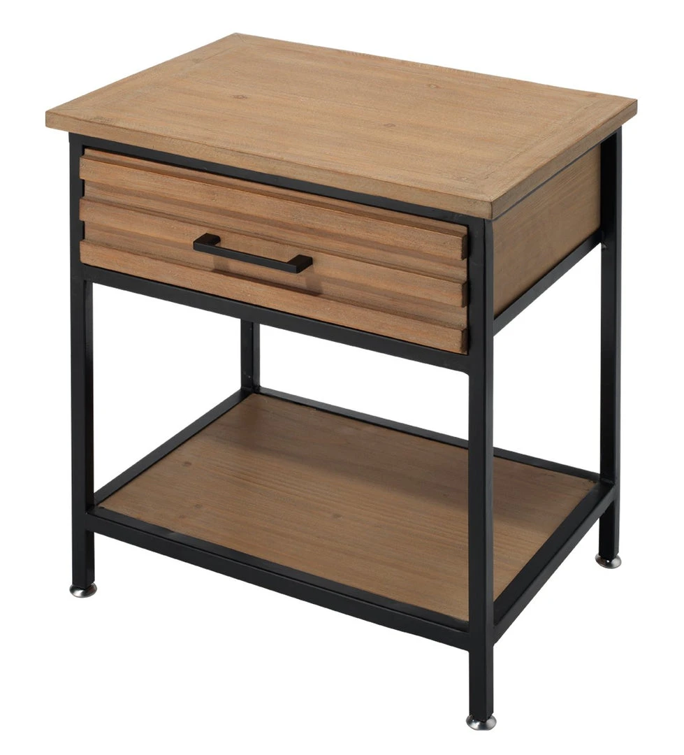Industrial modern loft style slatted wood side table with black metal base has a rugged no- nonsense simplicity. In natural wood finish and black steel. 1 drawer and one shelf