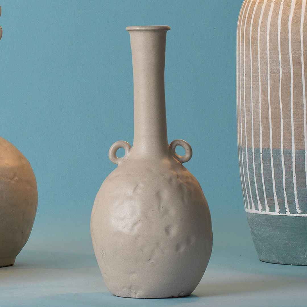 Inspired by the earthy elements of traditional ceramic pottery, the Medium Babar Vase features a naturally molded silhouette finished with a soft lustrous glaze. Its elongated neck and geometric accents give it an organic feel with visual interest. For decorative uses only.