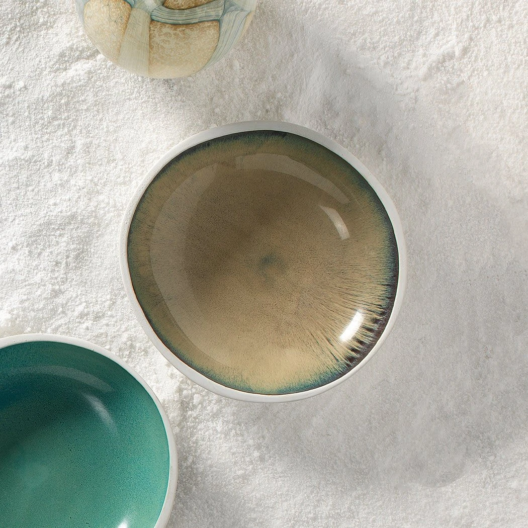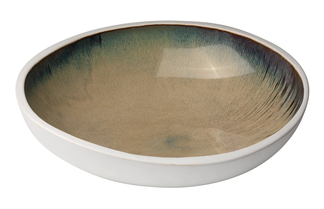 These unique platters and bowls are created using a reactive glaze that create a one of a kind pattern, so no two pieces are the same. They come in a sand or ocean color with a smooth matte white finish on the outside to add a touch of modern to these casual pieces.