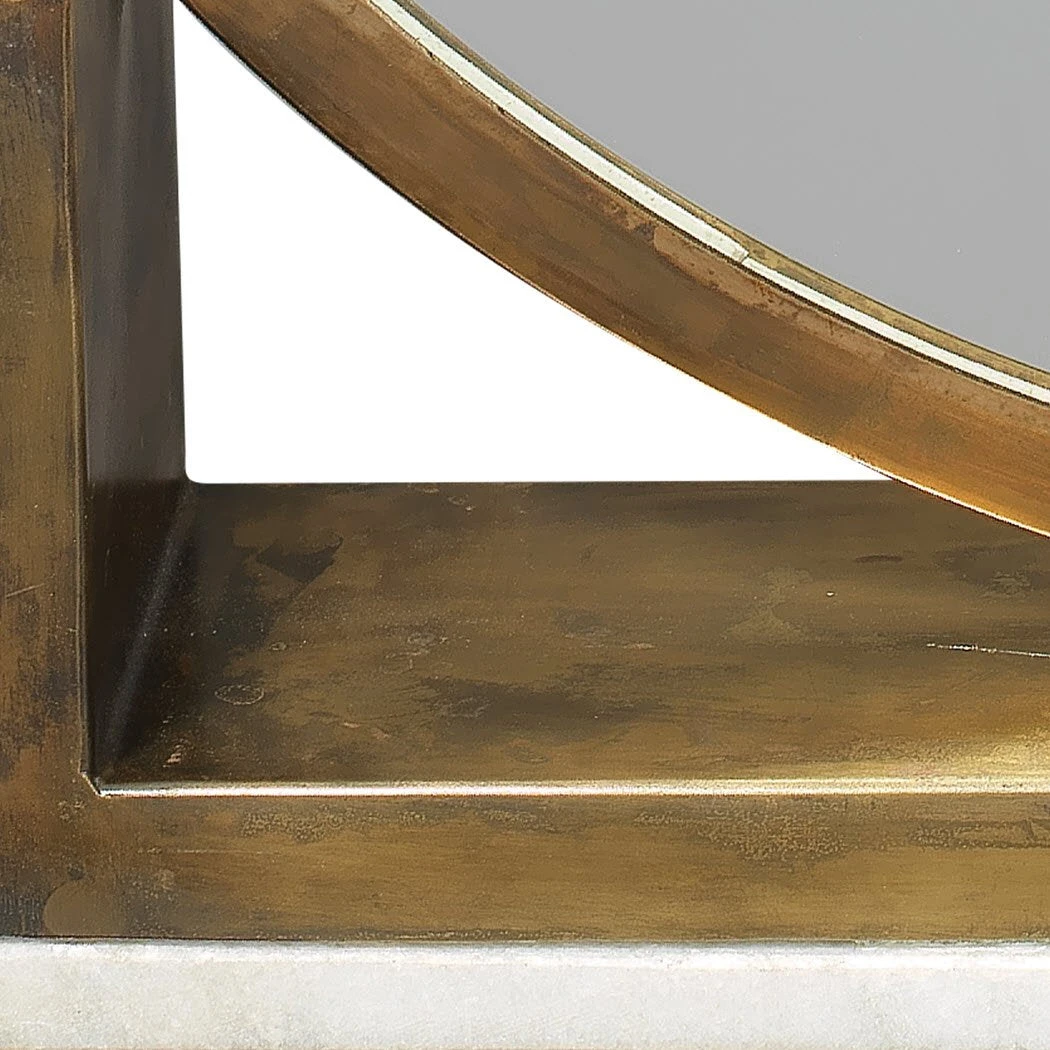 This modern twist on an elegant vanity mirror embraces simple lines in an antique brass finish and is delicately accented with a thin strip of white marble to ground this sophisticated design