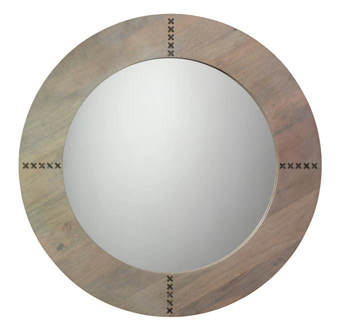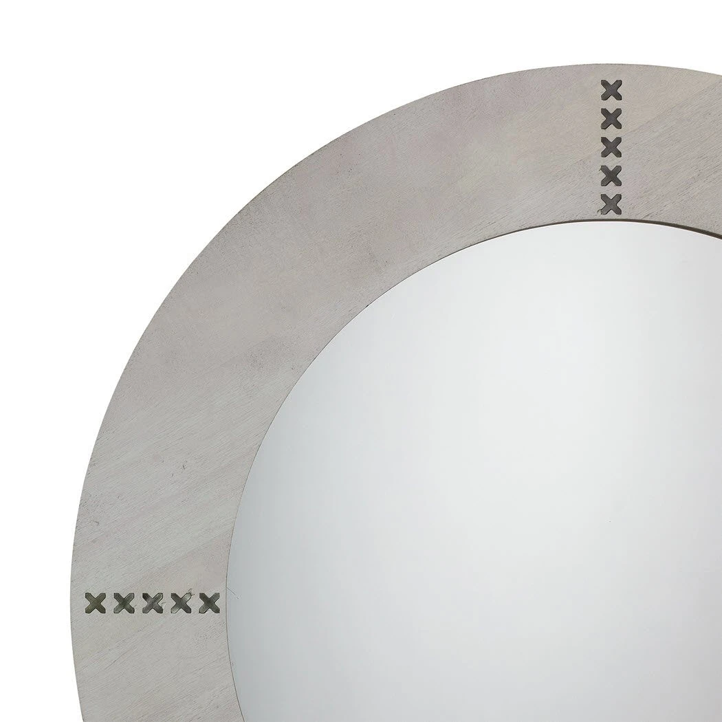 A beautifully crafted grey washed wood mirror with antique silver cross hatch metal inlays..