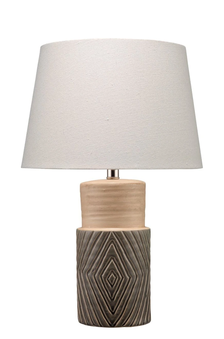 The tribal design of this table lamp has a ceramic glaze and contemporary and worldly feel. Lamp and lamp shade include. Ships in one box.