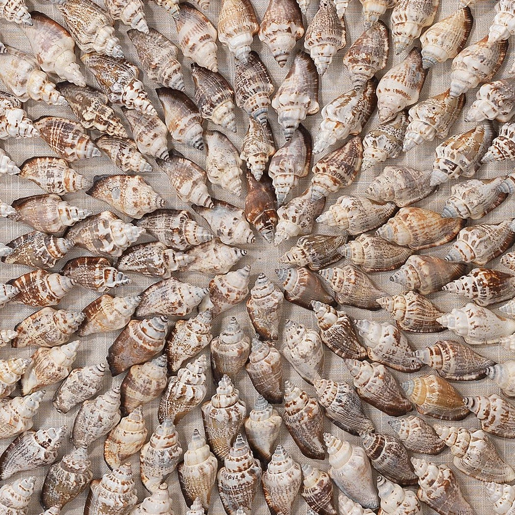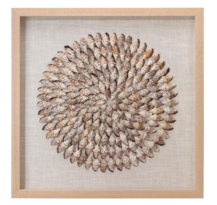 A revolving pattern of unique shell shapes create a circular pattern of organic beauty. Natural colors and textures of radiate outward while drawing you into this stunner from the sea. As if this wall art piece washed ashore, specifically for your wall.