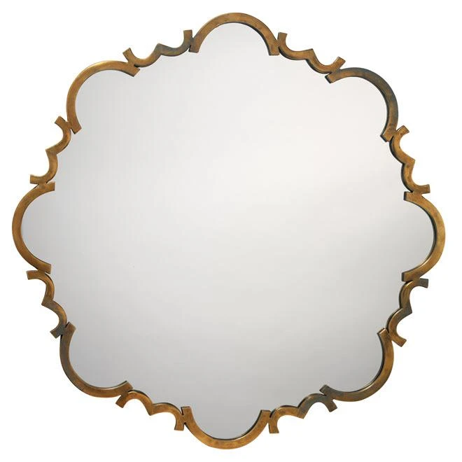 A new modern traditional piece with a scalloped edge frame in a hand worked burnished antique brass finish.