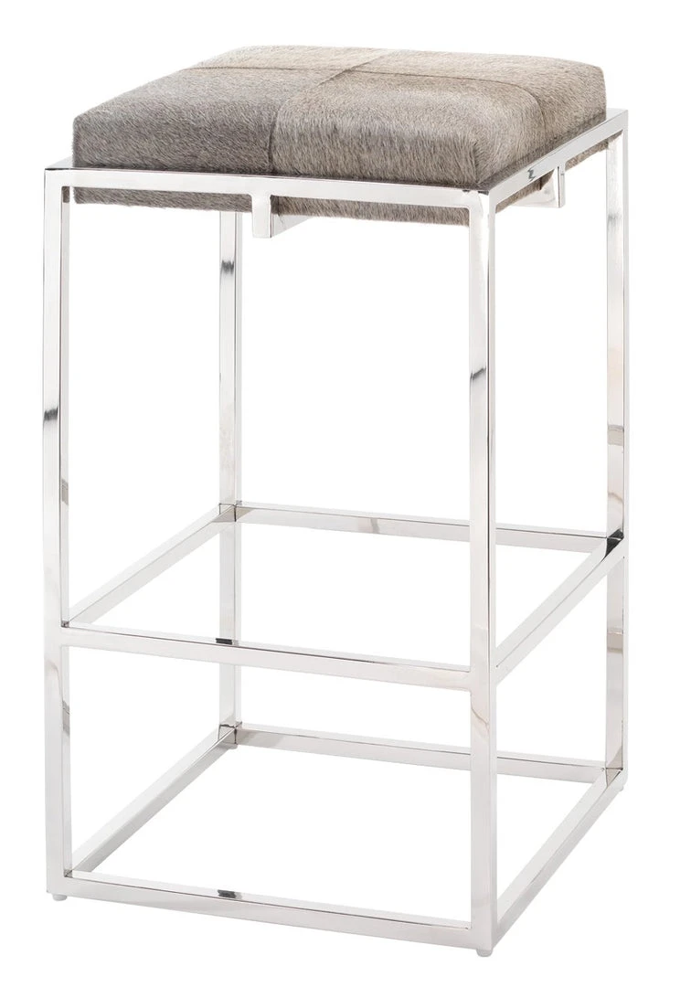An architectural metal framework makes a clean, yet modern statement. The Shelby Bar Stool is an Art Deco inspired seat with geometric bars and a grey hide cushion. The nickel base has a polished finish to give it a high-shine luster.
