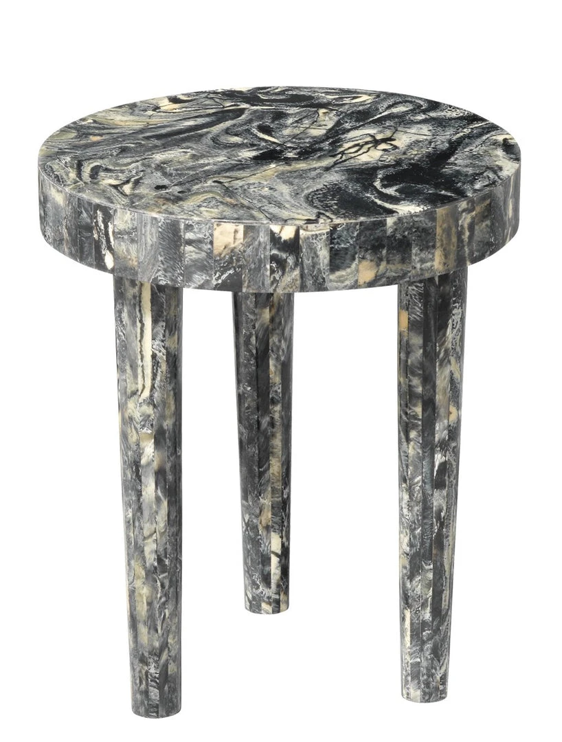 Swirled resin creates a captivating finish on this side table. Highs and lows of dark grey, whites and creams create endless swirls and unique patterns that will be different on each piece, making it truly a one-of-a-kind work of art.Finish will vary in shape, pattern and color. No two will be alike. Ships knock down, minor assembly required.
