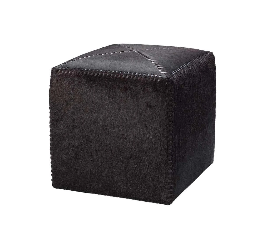Kick up your heels on the Small Ottoman with leather stitching. Upholstered in smooth high-quality leather hide, this ottoman has a dark and moody design that is amplified with incredibly luxurious Material. The panels of this piece are stitched together with contrast leather thread to give this piece a more angular shape.