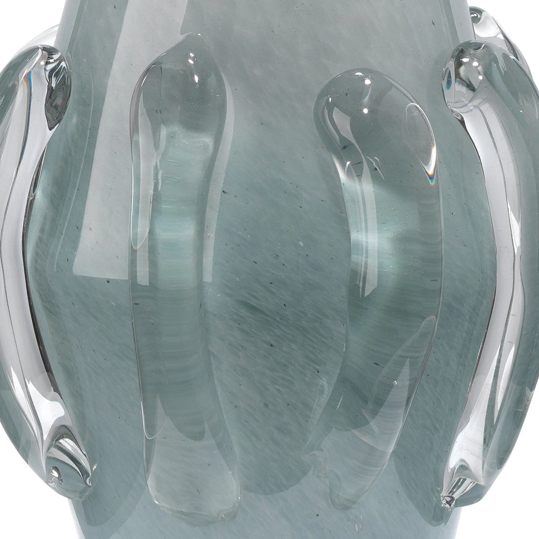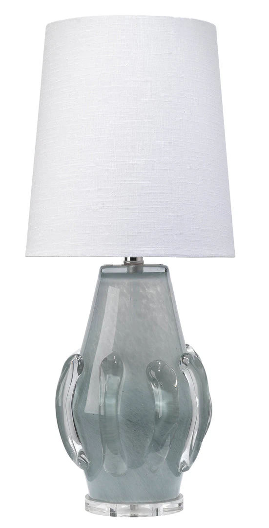 The Talon Collection table lamp?ÇÖs handblown art glass base is topped with a clean white linen cone shade and an acrylic ball finial and an arcylic base. Available in cornflower blue or clear glass, each is elaborately adorned with thick ?ǣribbons?ǥ of more handblown glass around the lamps body. True works of art; no two will be identical.
