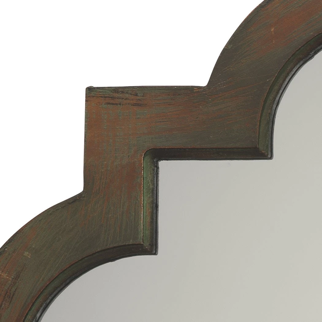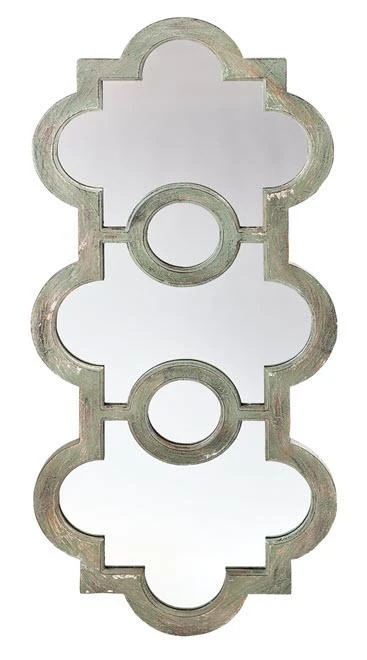 This mirror hangs vertically only. The scalloped edges provide a sophisticated style to this antique grey and green washed wood mirror.