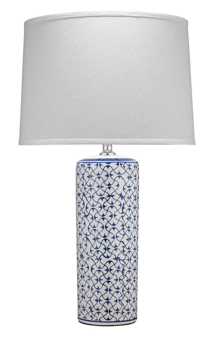 The delicate blue pattern on this white ceramic table lamp feels both masculine and feminine perfect for most spaces. Finial and harp included. Lamp and lamp shade included.