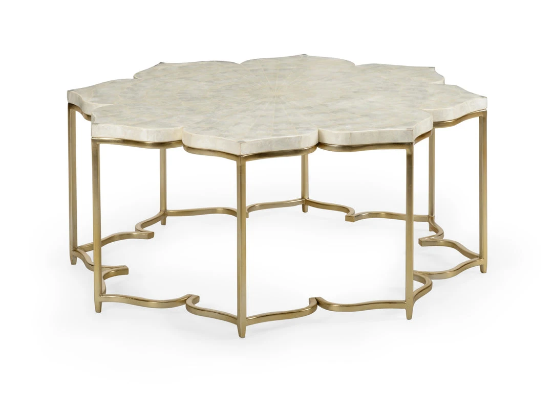 Lotus flower inspired cocktail table with metal base and capiz shell top.