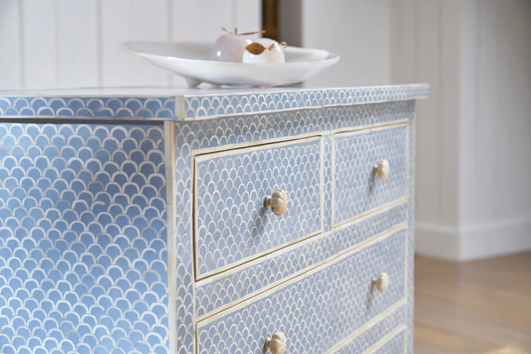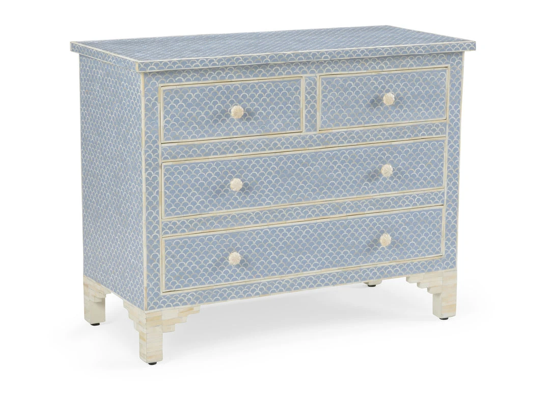 A picture perfect 4 Drawers Fish Scale Pattern chest. This unique piece exudes elegance in every dimension and will bring a touch of modern refinement to any space. Finished with white and turquoise bone inlay for top-to-bottom beauty and gorgeously standing on 4 accented carved legs, the Milford chest is charming in every angle.