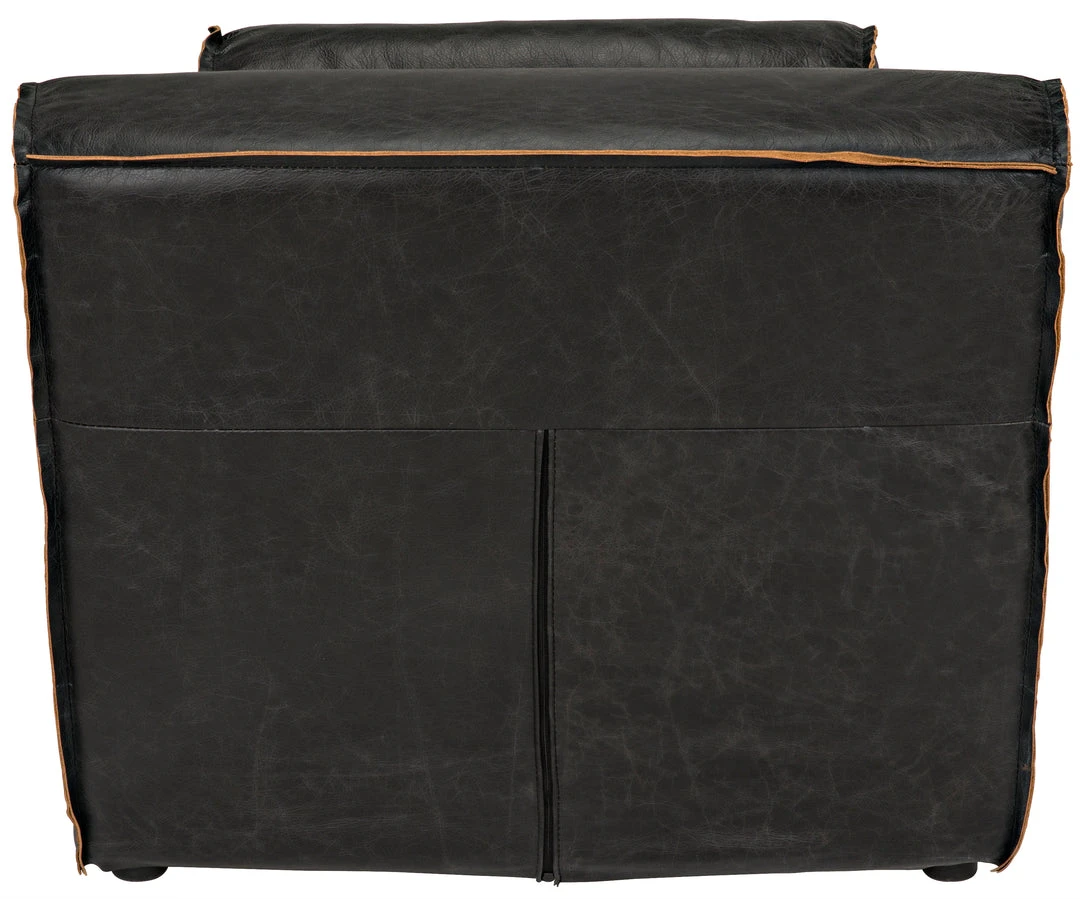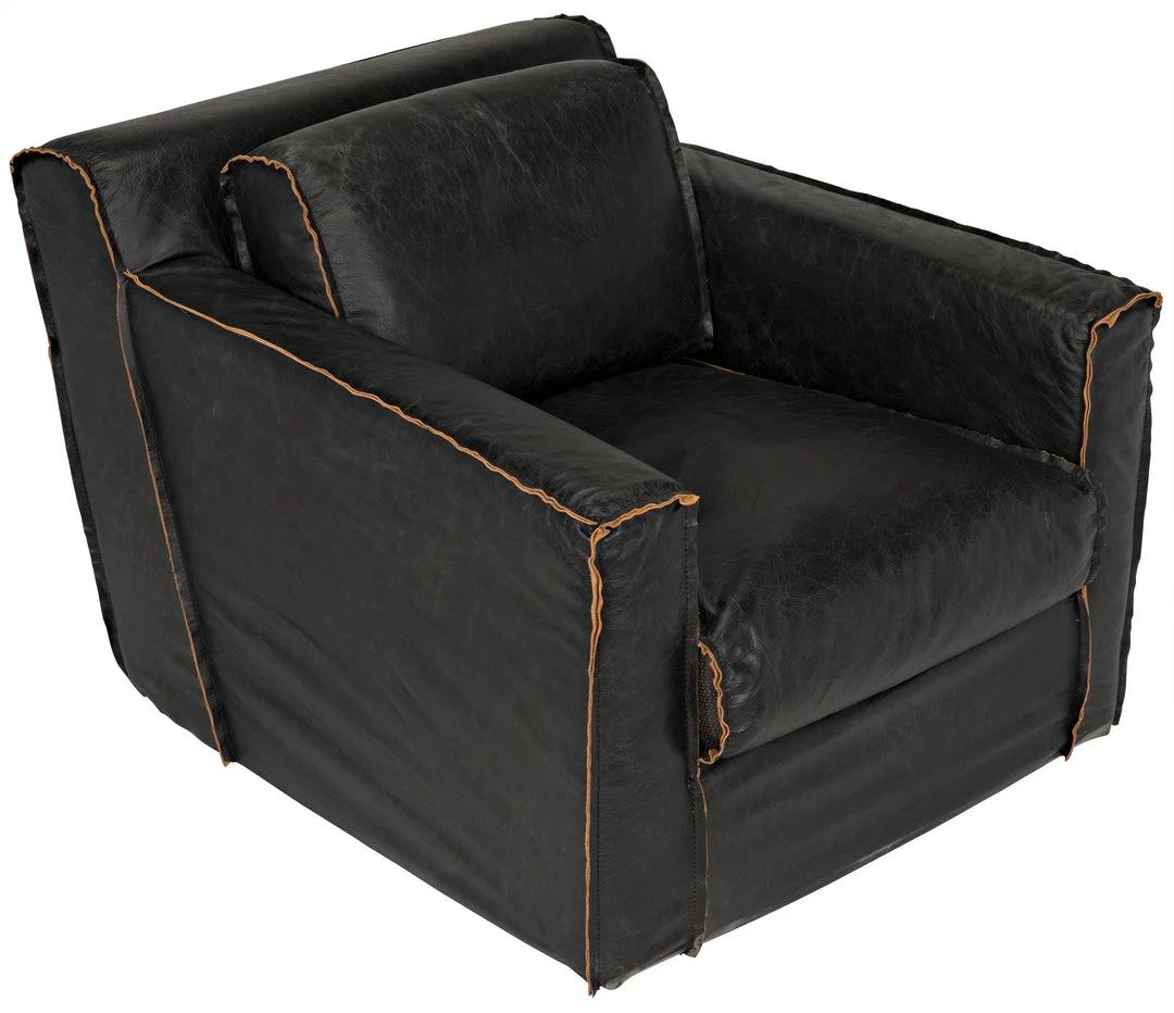 Eschewing the conceit that you must choose between style and comfort, this black leather armchair has something for everyone. It’s slouchy yet sophisticated, contemporary yet cozy, with a traditional style updated by modern touches like contrasting trim.