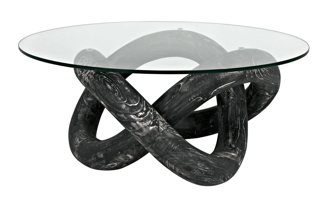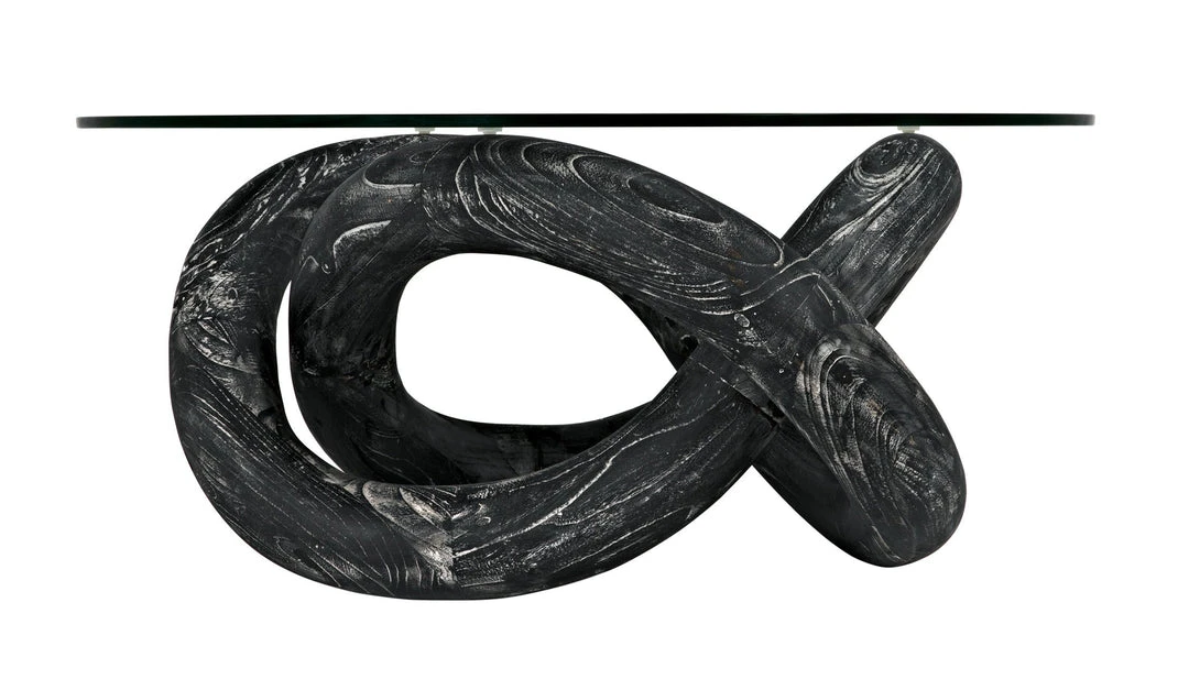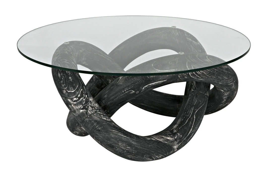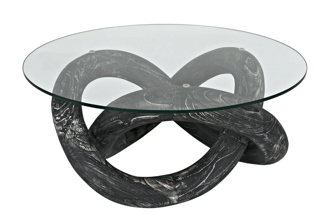 A bold looping base design in solid, responsibly harvested mindi wood is layered in our Cinder Black ceruse effect finish to amplify the beauty of the wood’s natural grain. Topped by a 35.5″ glass round, its smaller size also makes it an excellent side or accent table.