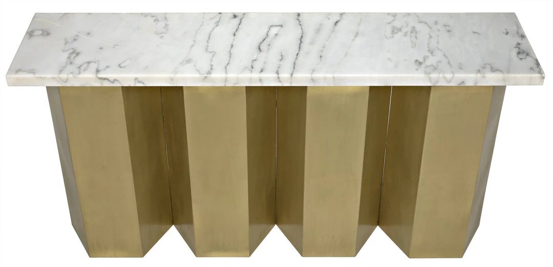 A striking slab of white stone tops an intriguing metal base finished in a burnished antique brass. The warmth of the modern metallic emphasizes the natural coolness of the stone, providing a contrast that complements the design magnificently.