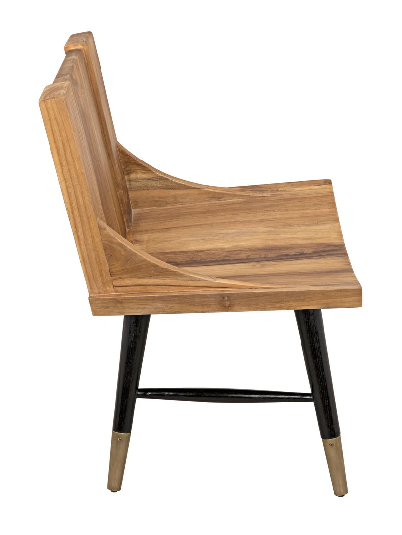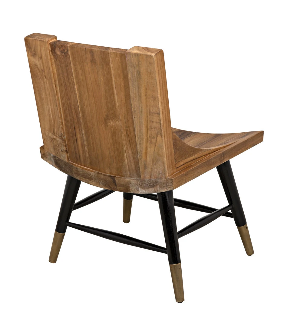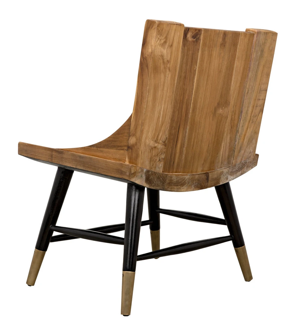 The Victor chair’s scoop design showcases the simple beauty of the teak wood’s grain. The wood on the seat is perfectly accented with a satin finish, and the chair’s legs are given a contrasting black finish and antique brass cap feet.
