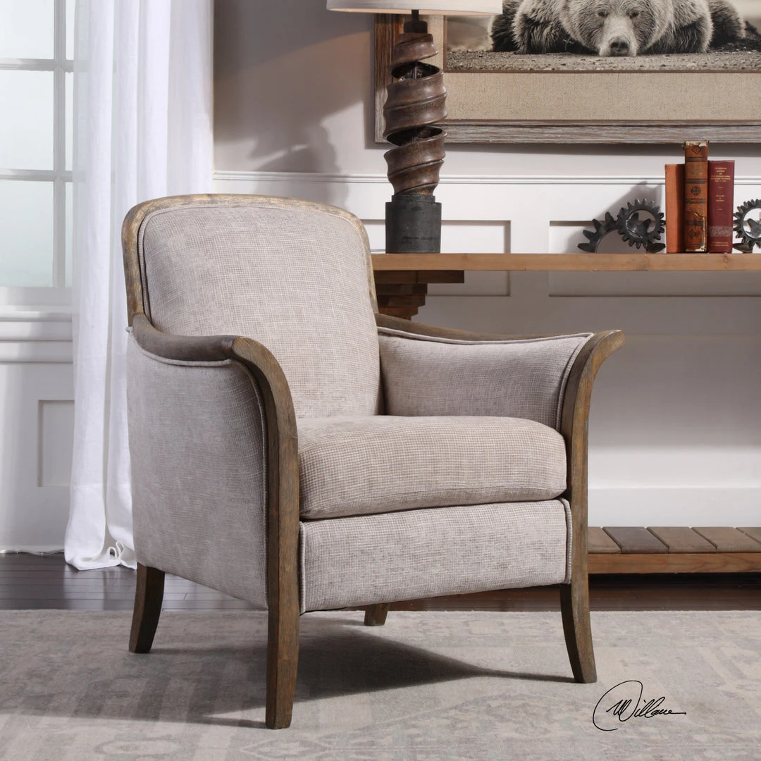 Solidly Constructed Chair Featuring Exposed Hardwood Finished In A Weathered Pecan And Tailored In Soft And Woven Shades Of Taupe And Stone. Welting Adds To The Elegance Of Its Shape Amplifying Fluid Lines All The Way Down To The Tapered Legs. Seat Height Is 19”.