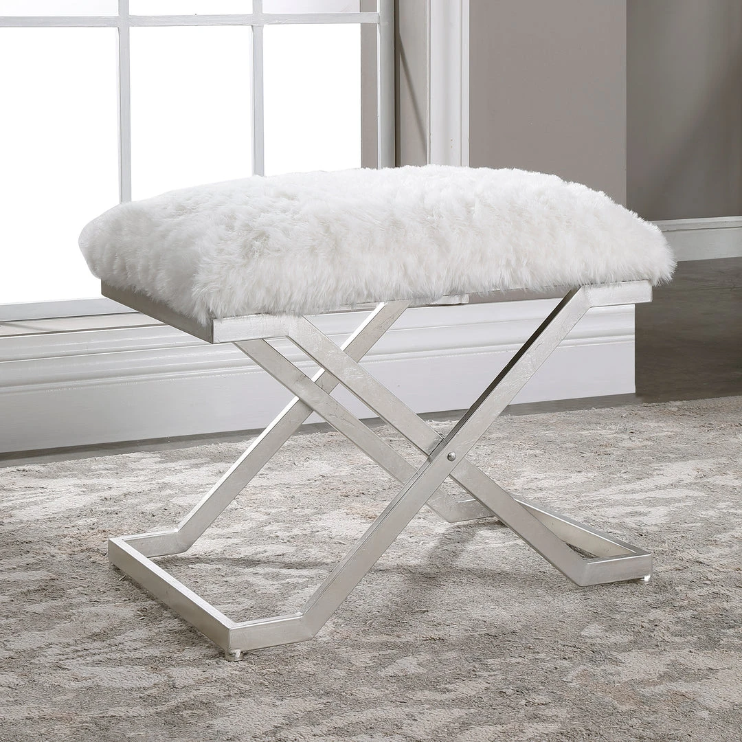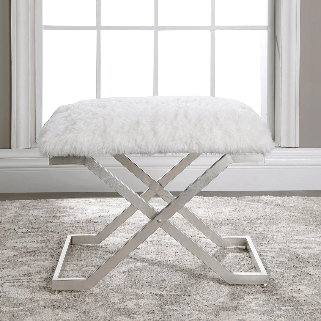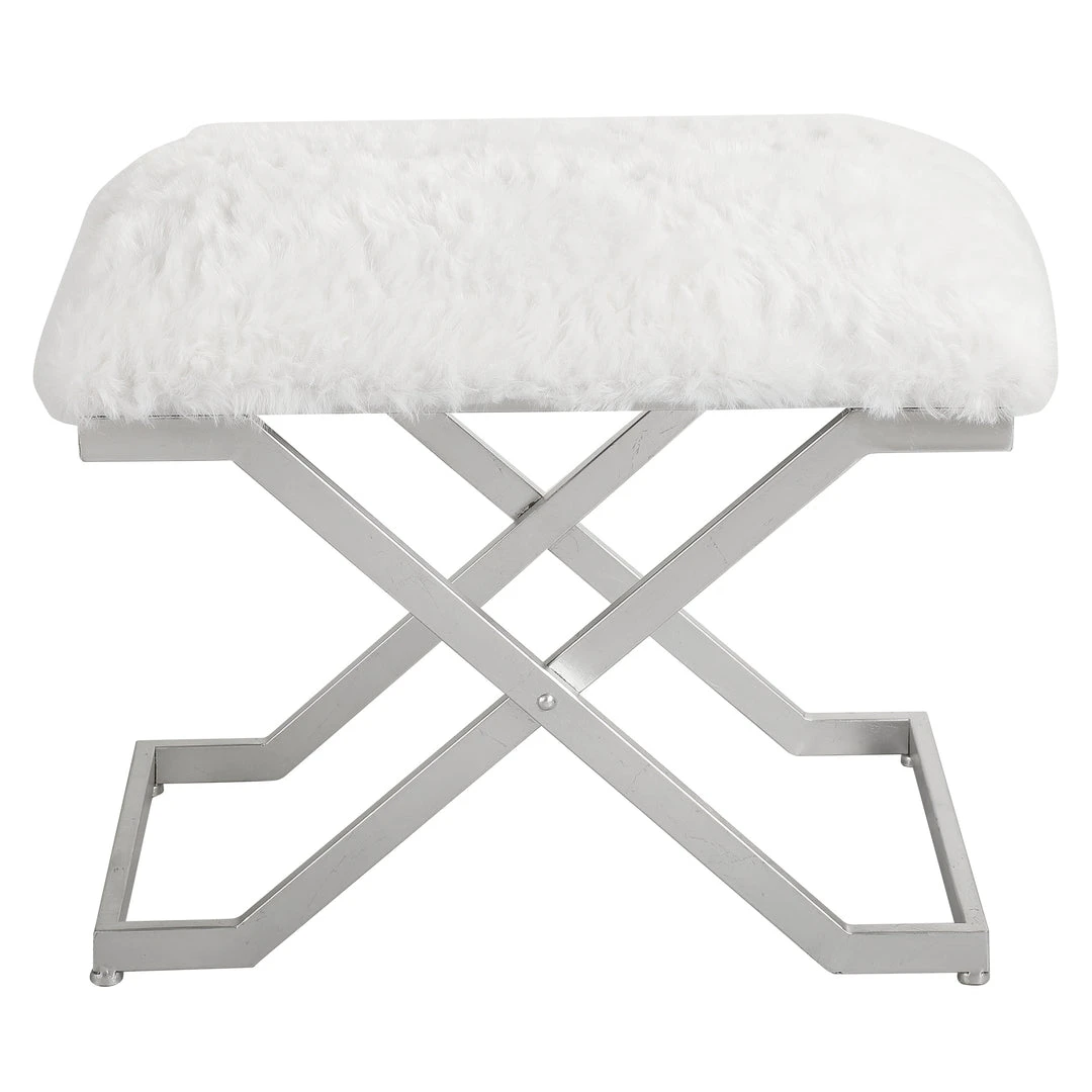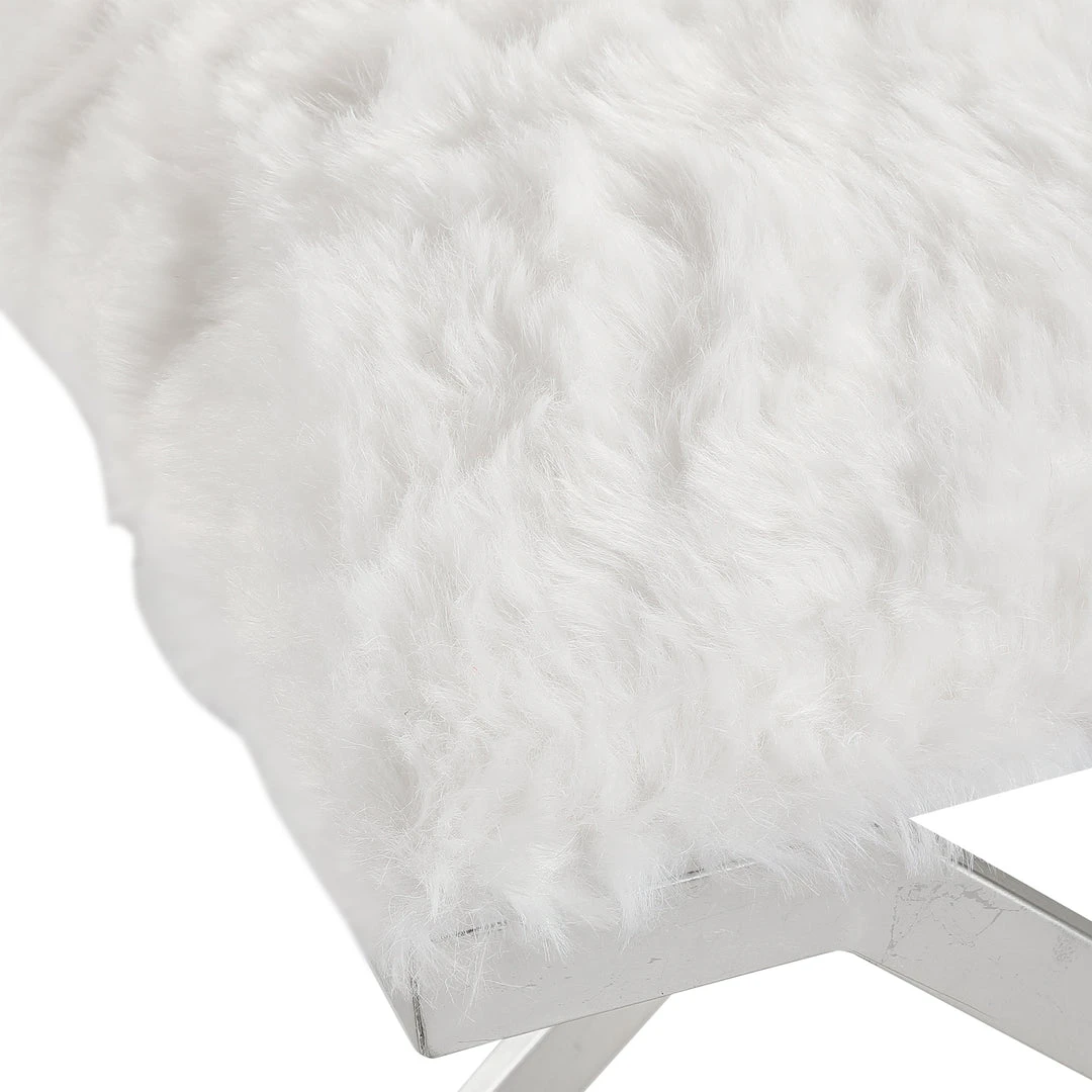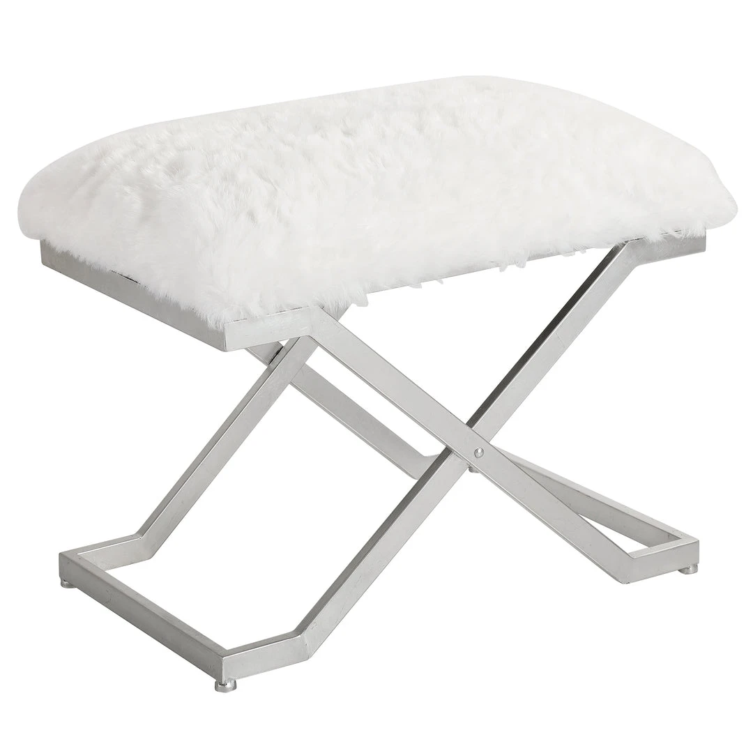 Plush Faux Fur In Soft White Atop Legs Of Thick Industrial Hand Forged Iron Finished In Brushed Silver Leaf.