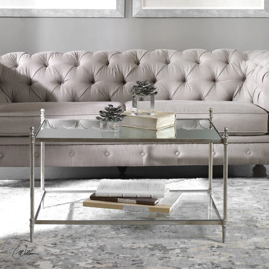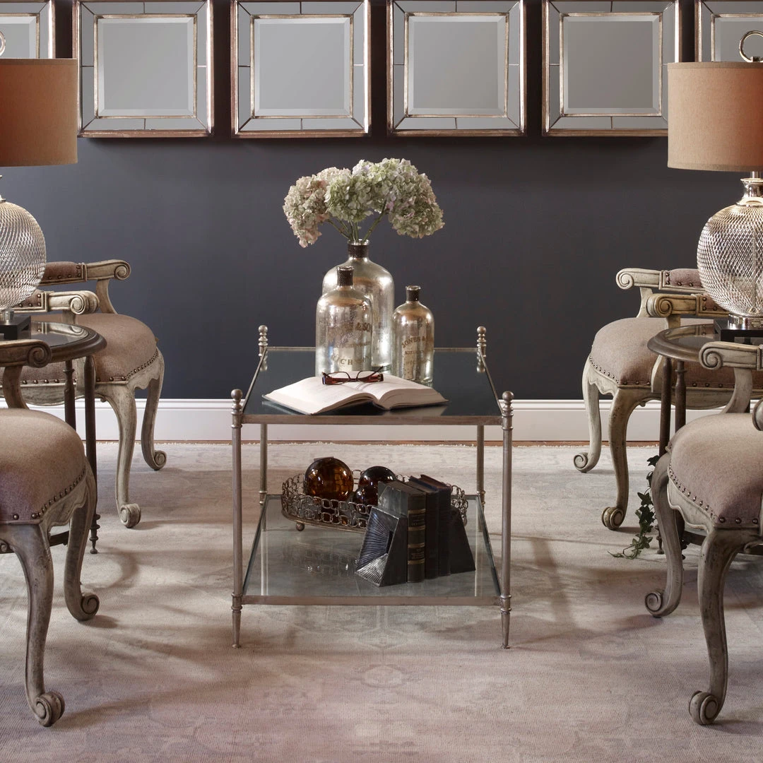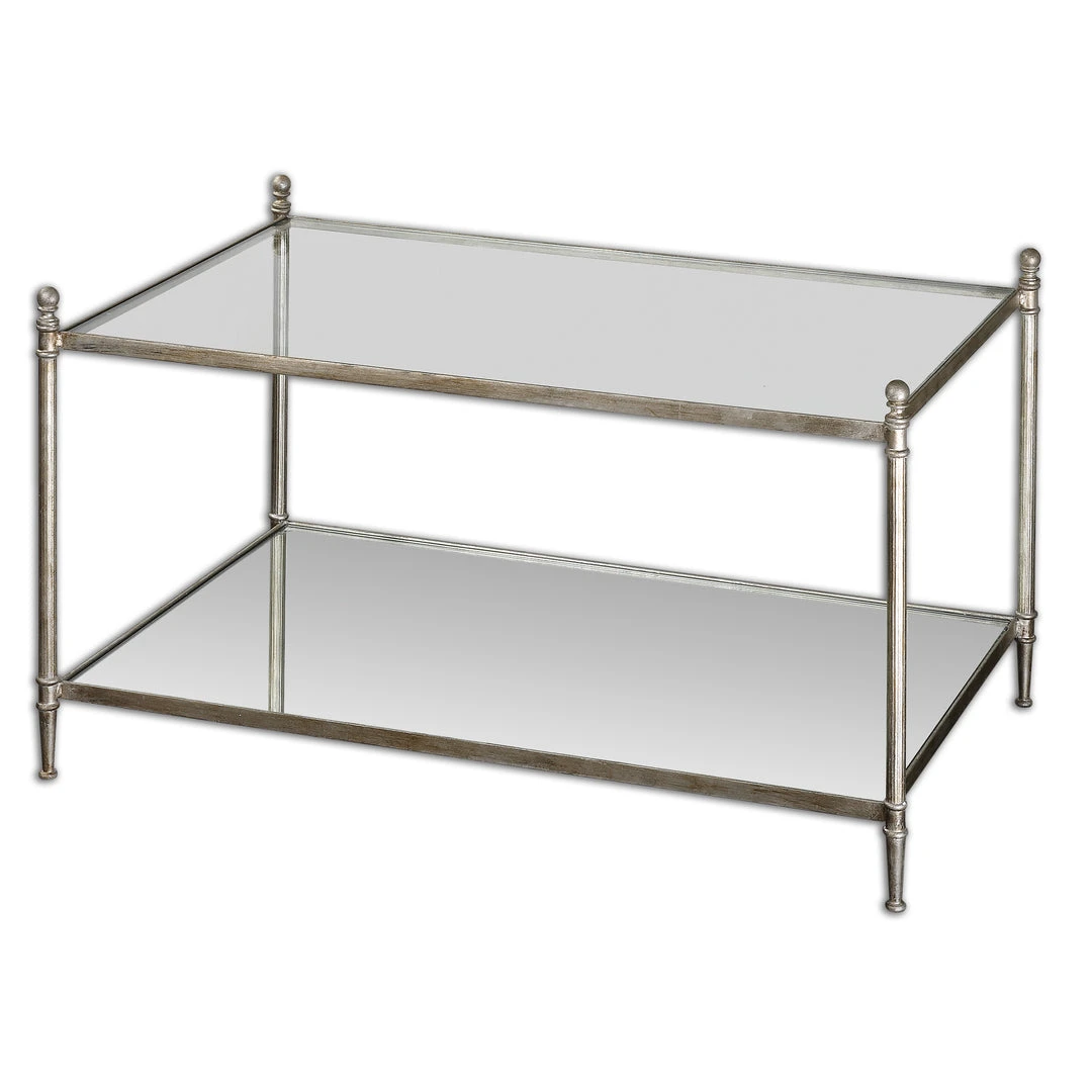 Forged Iron Frame In Antiqued Silver Leaf With A Mirrored Top And Clear, Tempered Glass Gallery Shelf.