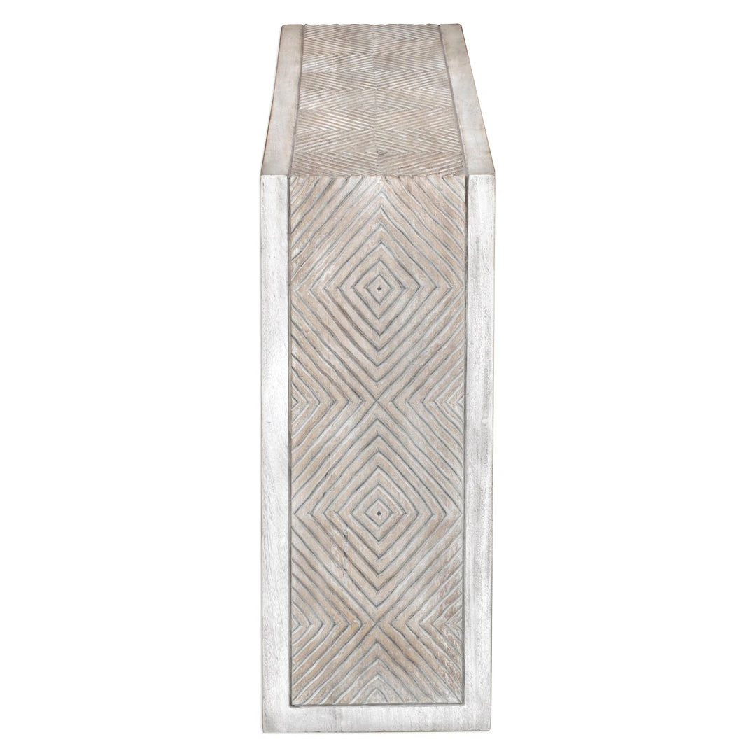 Finished In An Aged Bone White Over Mahogany Veneer With A Multi Level Display, Featuring A Hand Carved Geometric Top In Solid Mahogany Wood In A Warm Oatmeal Wash.