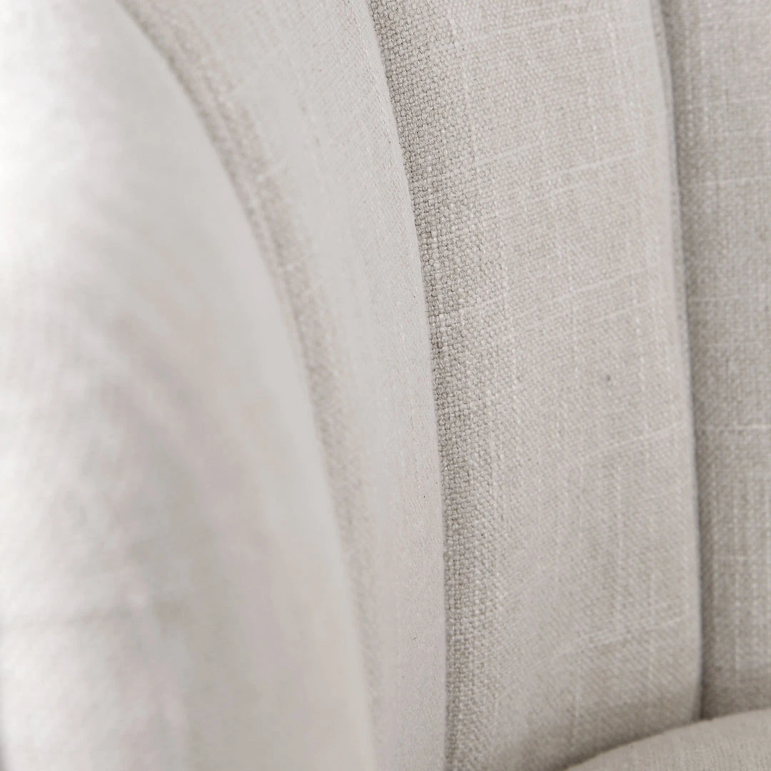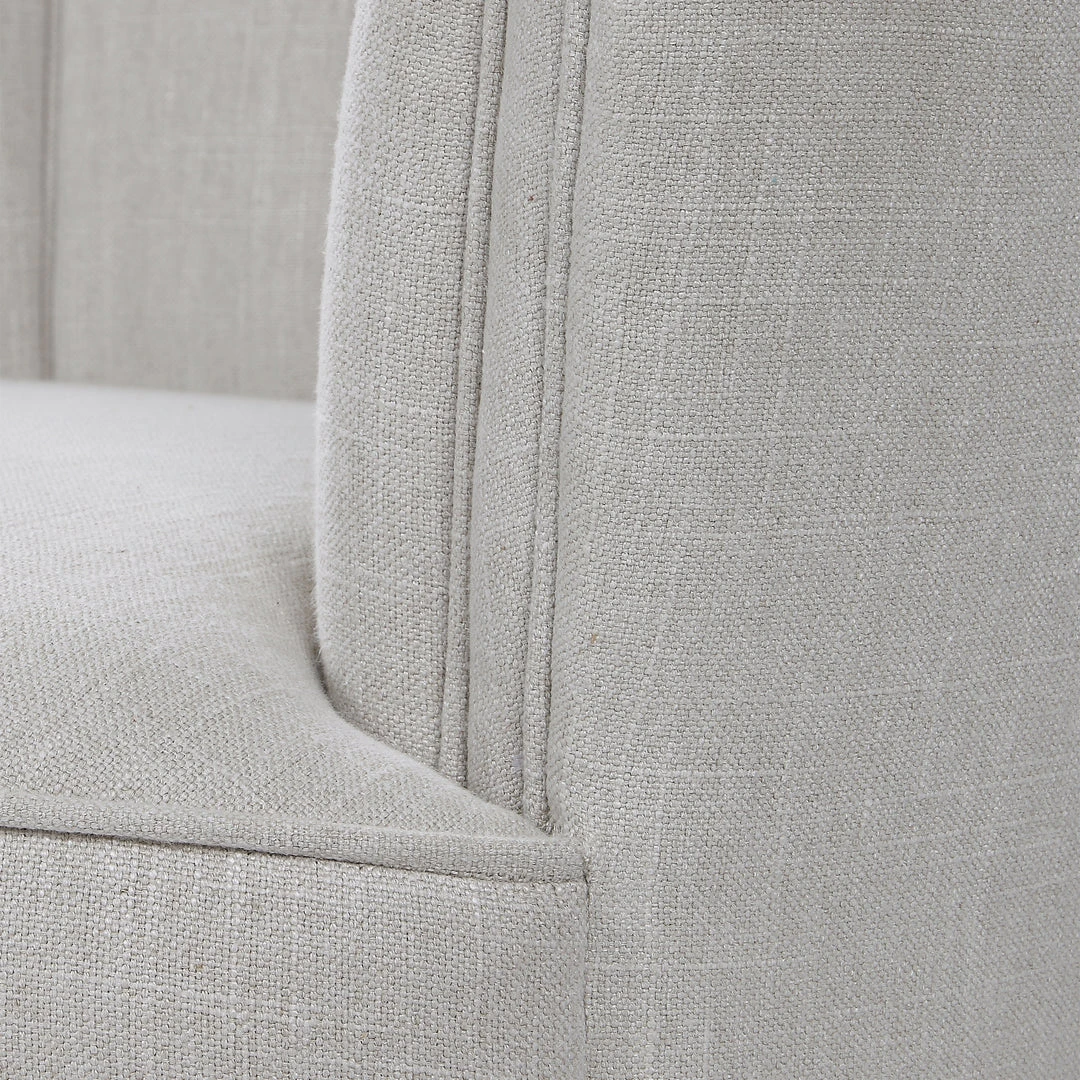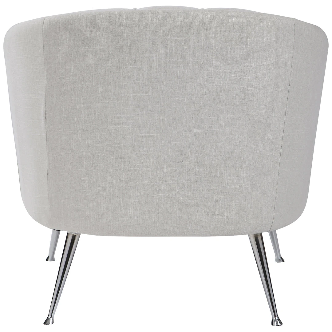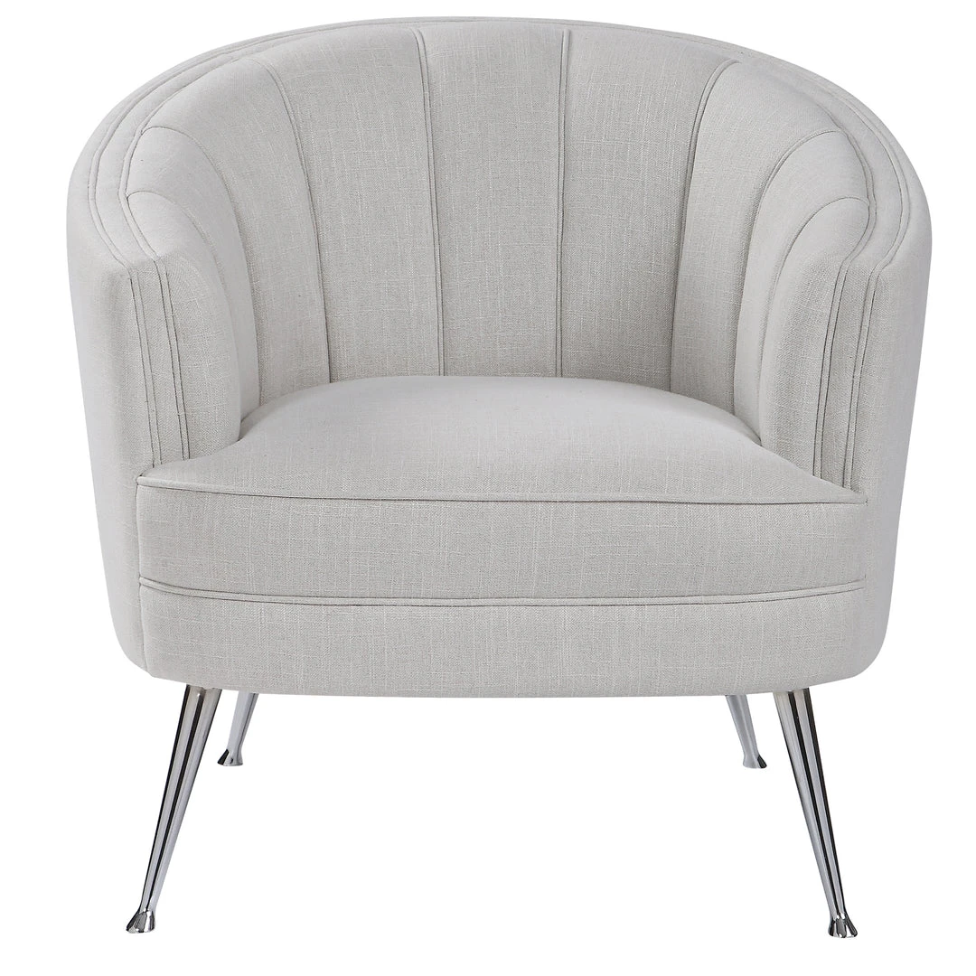 The Perfect Balance Of Retro And Modern Style, This Welt Trimmed Barrel Back Chair Is Covered In A Casual Light Tan Fabric With Channel Tufting And Polished Nickel Tapered Legs. Seat Height Is 19″.