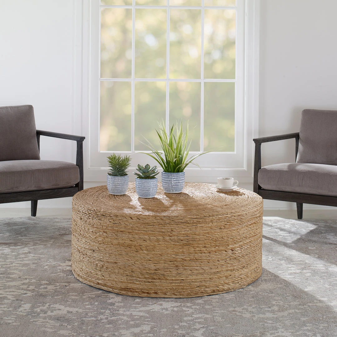 Equal Parts Relaxed And Refined, This Round Coffee Table Embodies Casual Coastal Style. Featuring Natural Woven Baa Concentrically Wrapped To Create Unique Color Patterns And Textures.