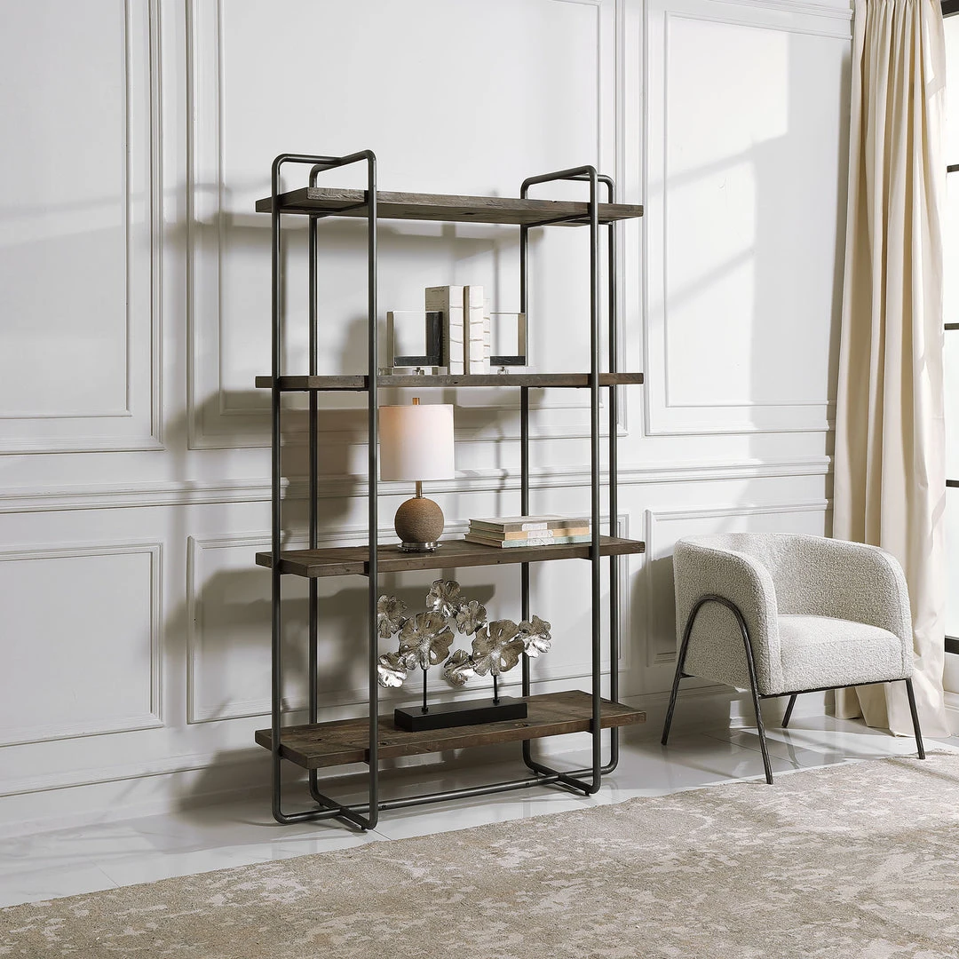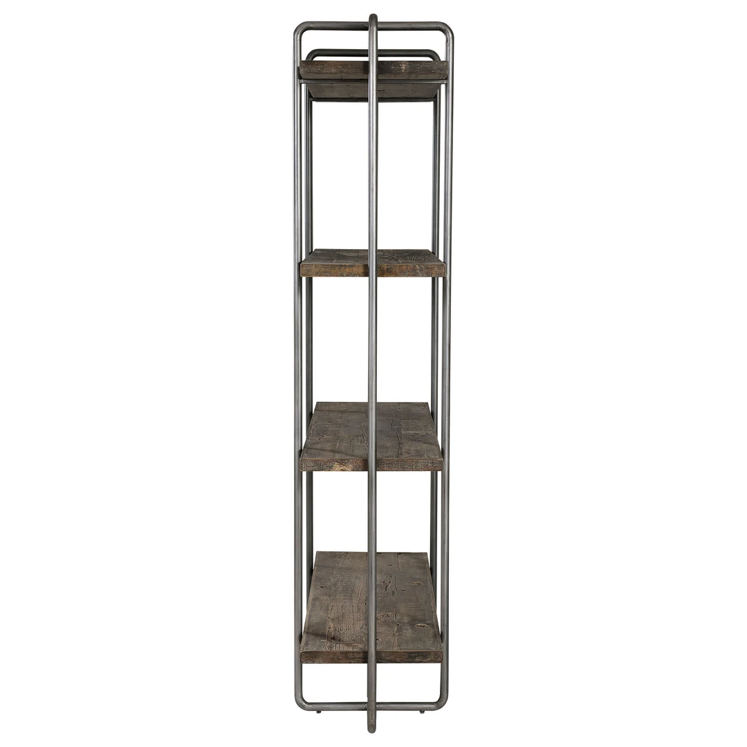 Exhibiting An Urban Industrial Feel, This Etagere Features A Steel Frame Finished In Dark Brushed Pewter. The Four Floating Shelves Are Constructed From Recycled, Reclaimed Boat Wood Collected From Old Chinese Fishing Vessels. This Statement Piece Showcases Years Of Use With Natural Wood Grain Texture That Has Subtle Hints Of Color. Solid Wood Will Continue To Move With Temperature And Humidity Changes, Which Can Result In Cracks And Uneven Surfaces, Adding To Its Authenticity And Character.