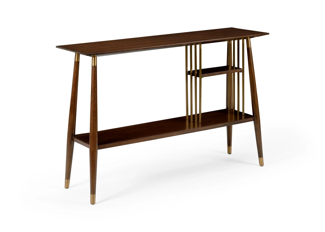 Mid-Century Inspired Console. Hardwood Construction With Walnut Stain And Antique Brass Accents.