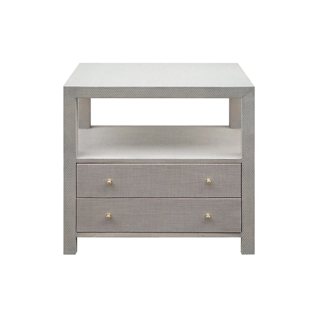 With its sophisticated yet subdued combination of textures, the Hattie two drawer side table delivers style and grace to any room. Grey linen drawers with petite brass pulls sit elegantly within a coordinating grey grasscloth frame.