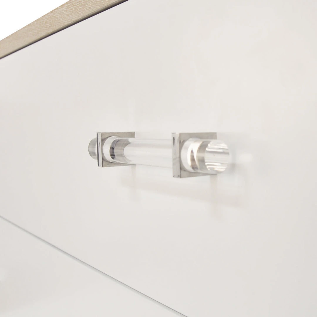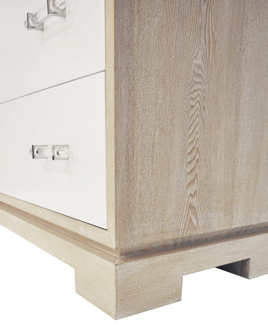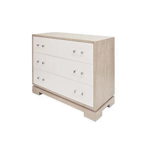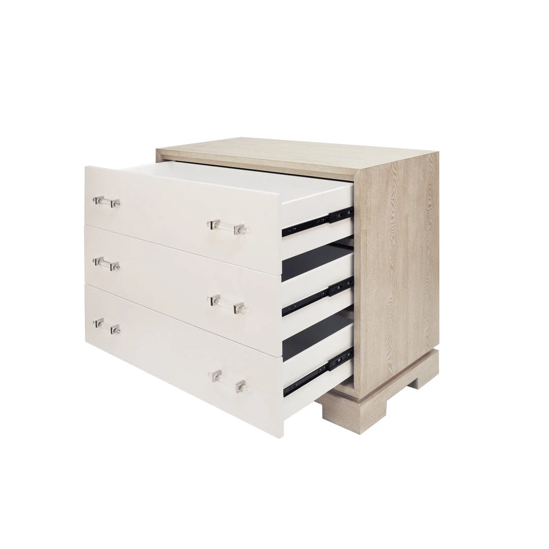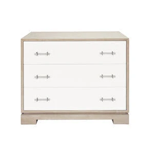 The on-trend, highly visible grain pattern on our cerused oak Whitney chest coordinates beautifully with your Mid Century or Farmhouse style! Three roomy drawers float above the elegant foot detail, and acrylic and nickel hardware finish the look. Drawer fronts finished in contrasting matte white lacquer.