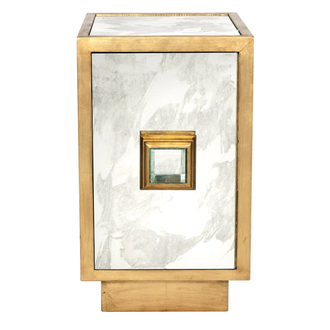 Looking to amp up your style with megawatt glamour? Our Savannah side table cabinet is an extraordinary pairing of one-of-a-kind antique mirror overlaid with hand-applied, gold leaf overlay and border. Greek key base detail and gold square hardware elevate this show piece to five star status. Includes fixed interior shelf for nice utility.