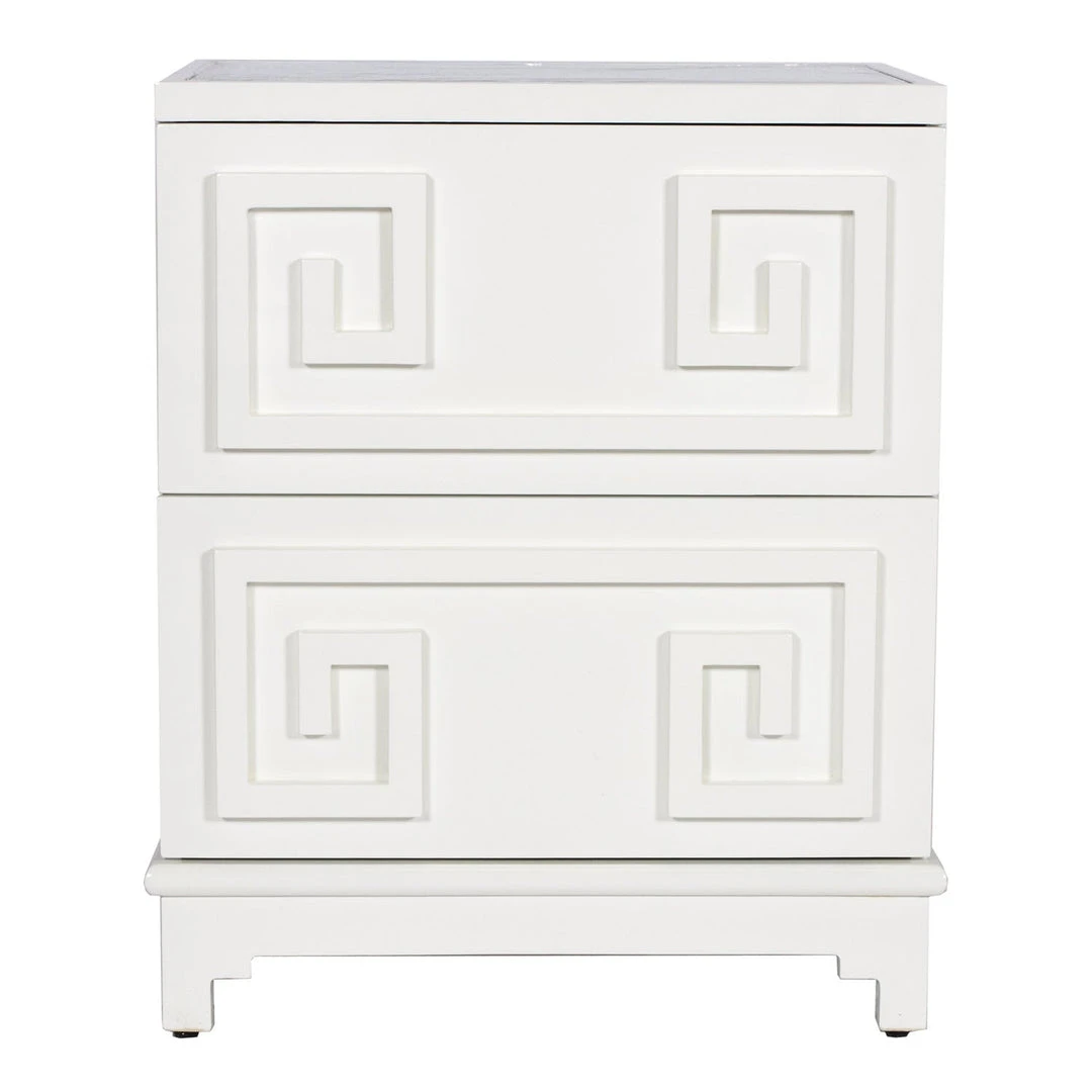 The Greek key geometry of our Pagoda two drawer chest is one of the earliest decorative symbols in art and architecture. Looks great paired with many design styles including Empire and Hollywood Regency. Our signature, glossy white lacquer finish lends a touch of glamour to this classic design.
