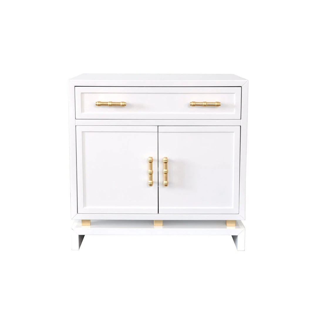 This charming, Asian-inspired lamp table instantly elevates your space. Whether adorning a hallway or living room, the matte white lacquer finish complements virtually any color scheme. Gold leaf, bamboo style hardware adds a stylized, natural element. Plenty of useful storage with drawer and cabinet, so Marcus is not only gorgeous, but also practical.