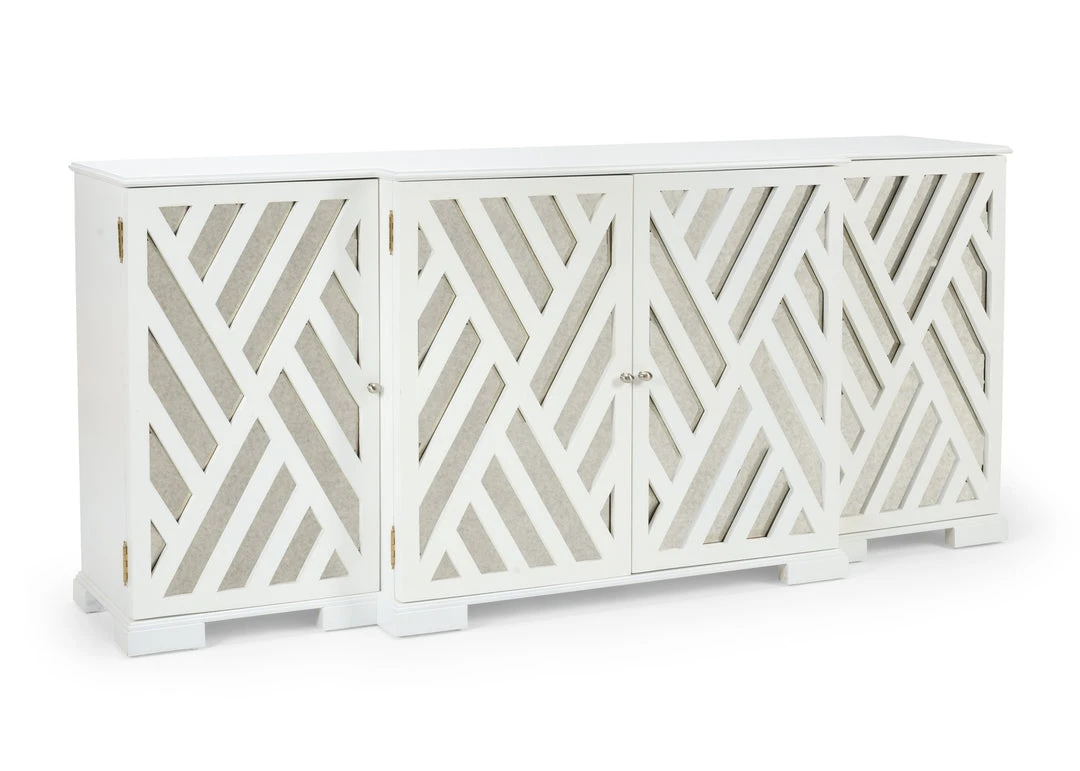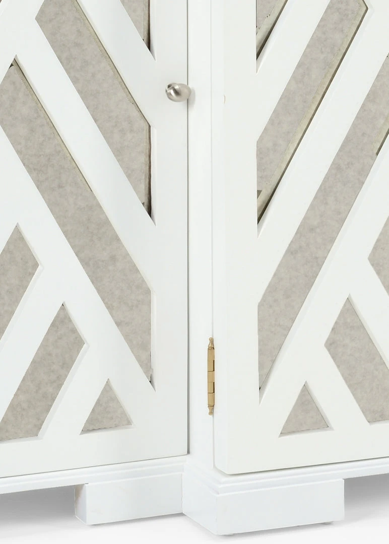 This charming sideboard features white painted wood with antique mirror backed doors complemented with polished nickel hardware. The Chelsea House Tidewater Sideboard will make a statement piece in your living space or entryway.