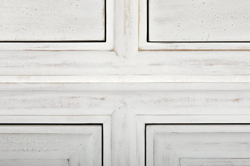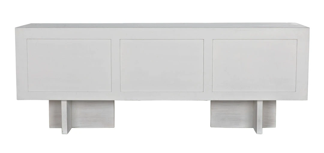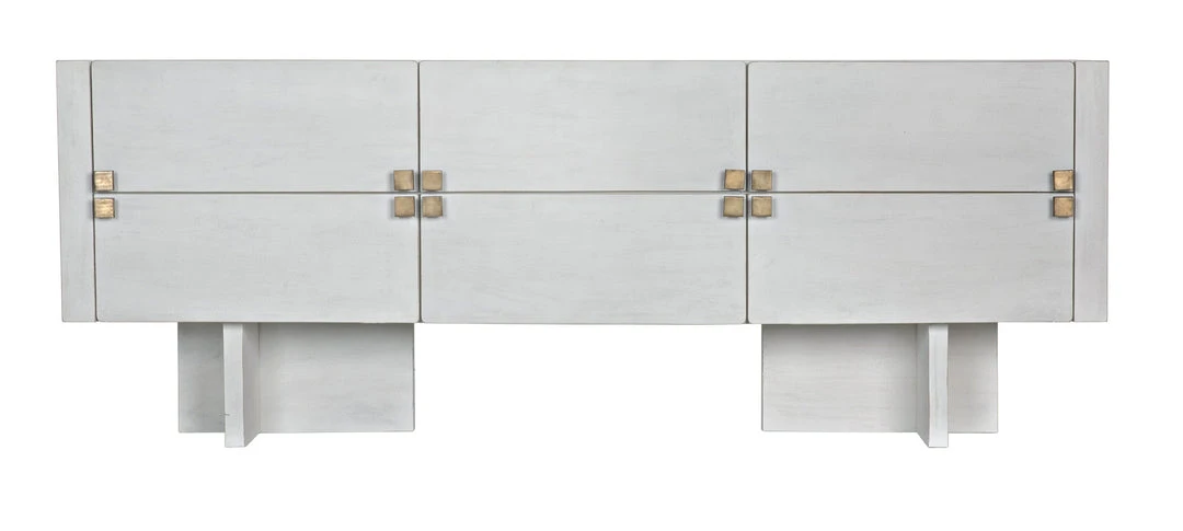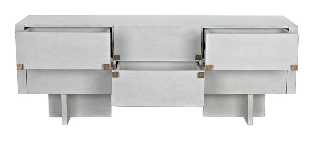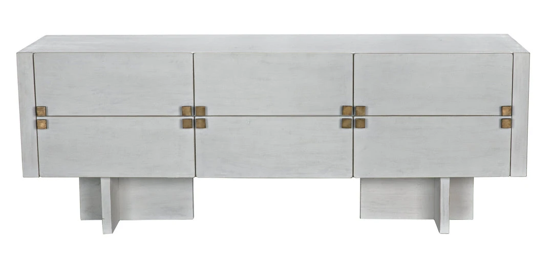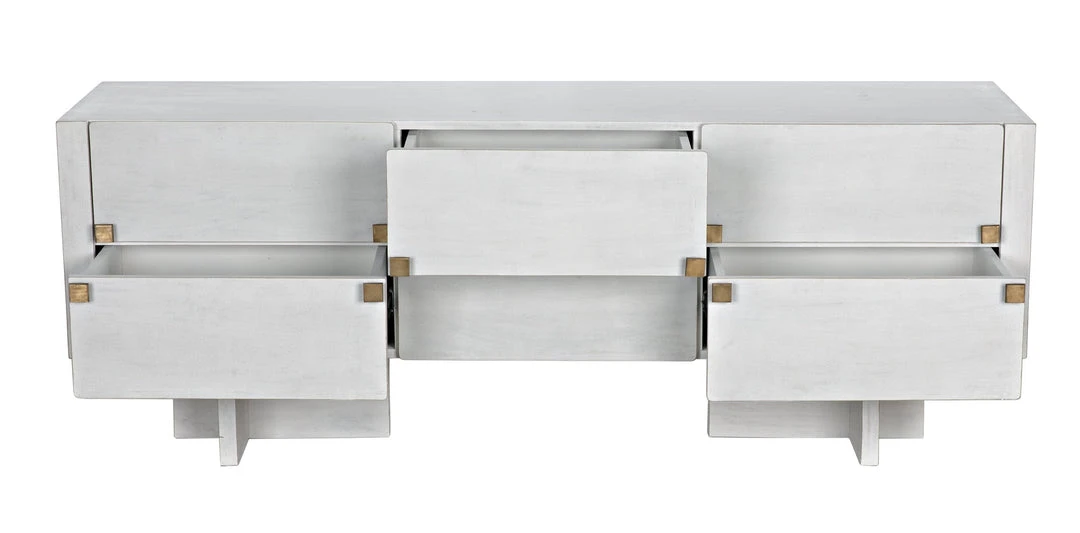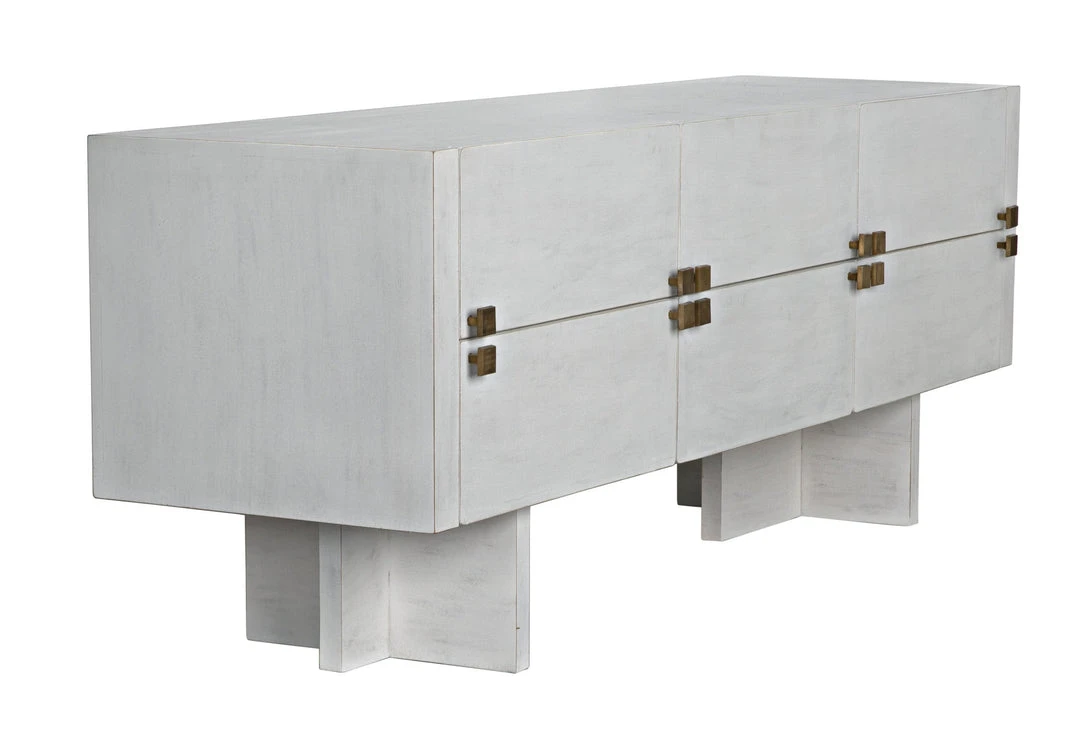 This powerful design turns a traditional sideboard into a style statement. Handcrafted of fine mahogany in a clean whitewashed finish, it features six drawers and provides generous storage. Addition features include square drawer pulls that double as striking accents, and a tall T-shaped base that supplies height.