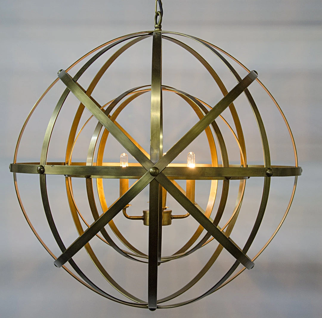 An armillary inspired pendant encircles four small bulbs to provide soft flattering lighting when lit, and a stunning sculptural accent during the day. Available in a burnished antique brass finish.