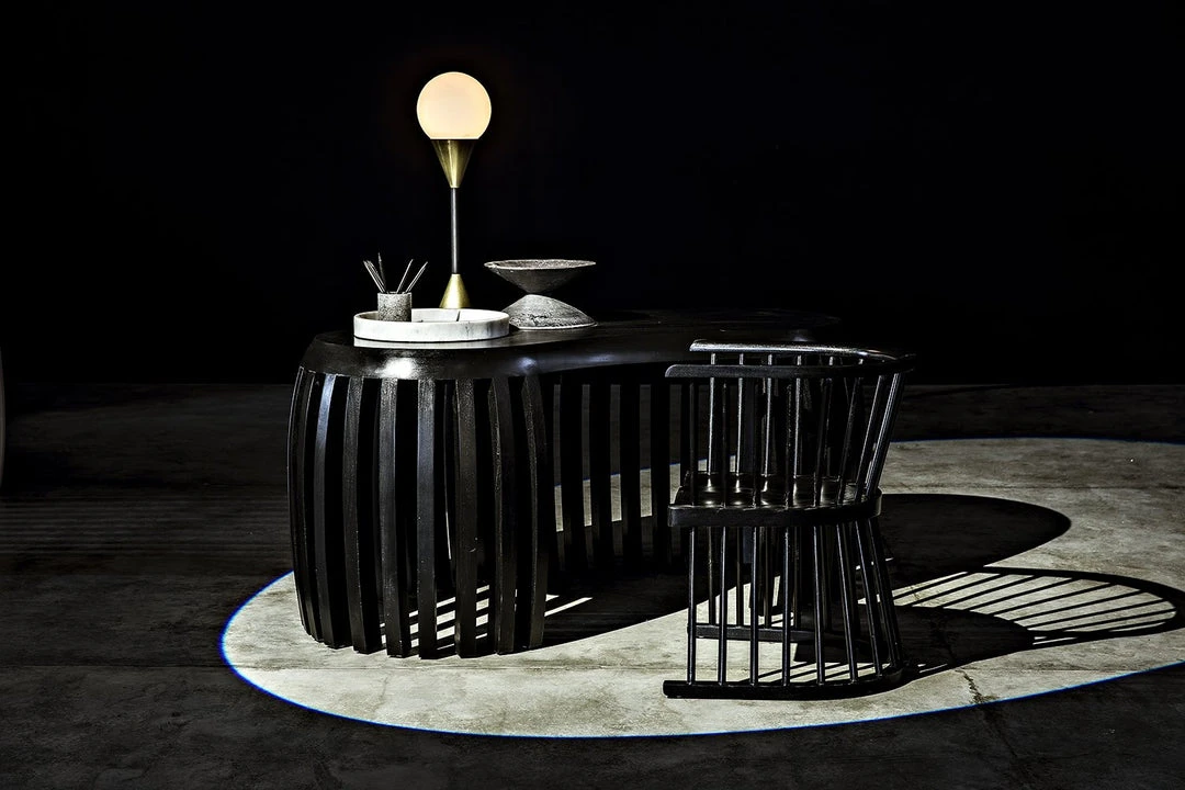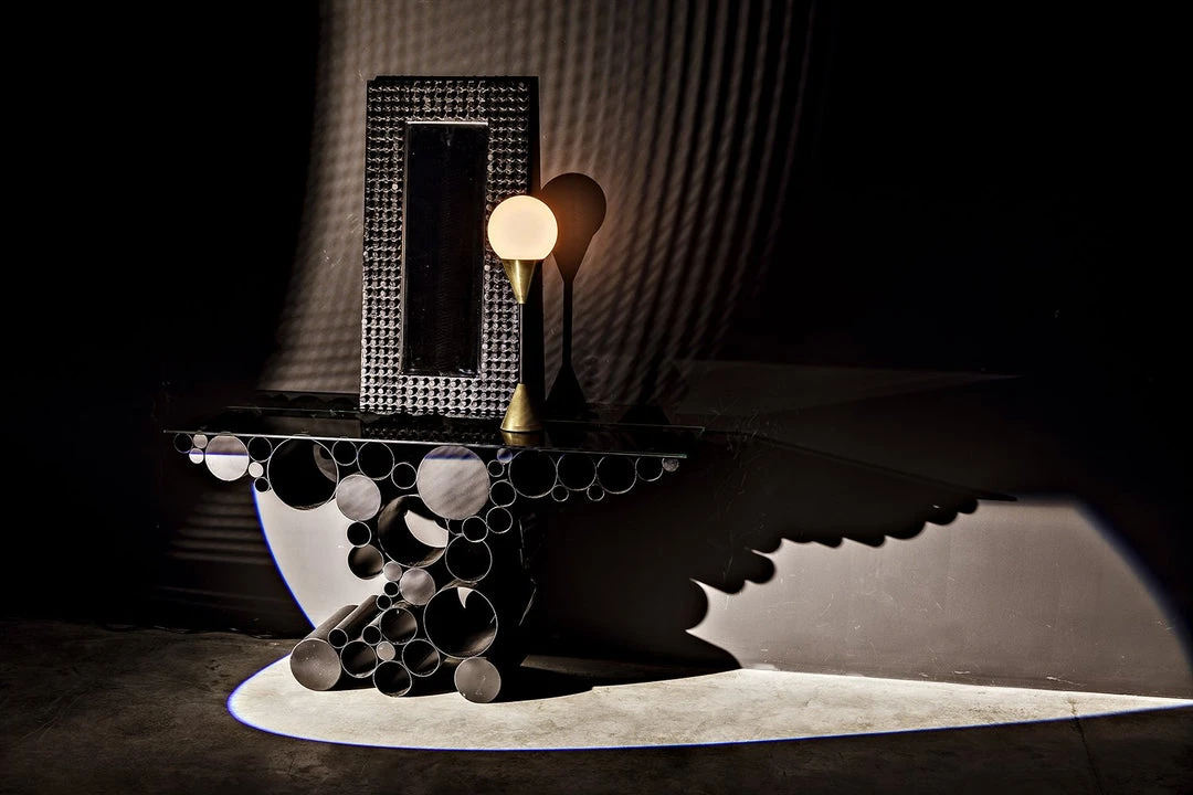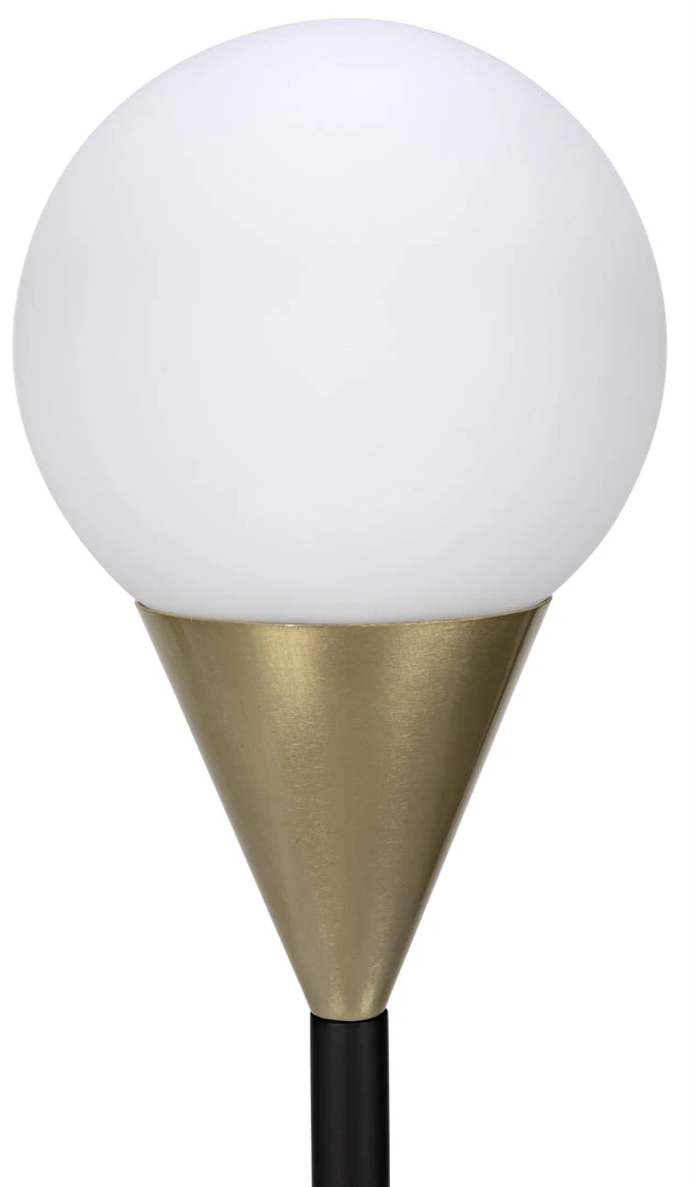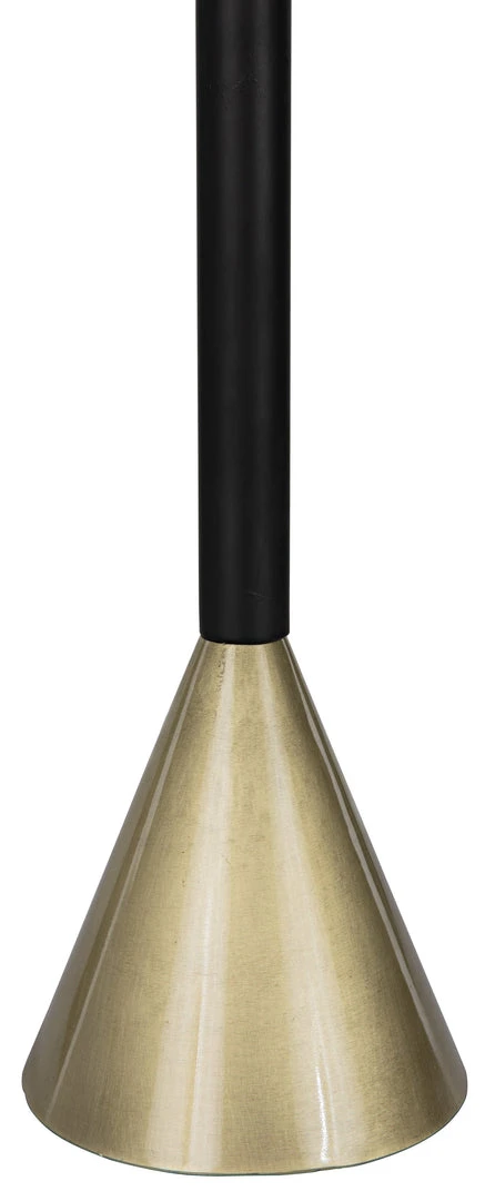 This unique sconce provides a touch of soft, flattering light, in an unexpectedly contemporary manner. Handcrafted of metal with black and antique brass finishes.