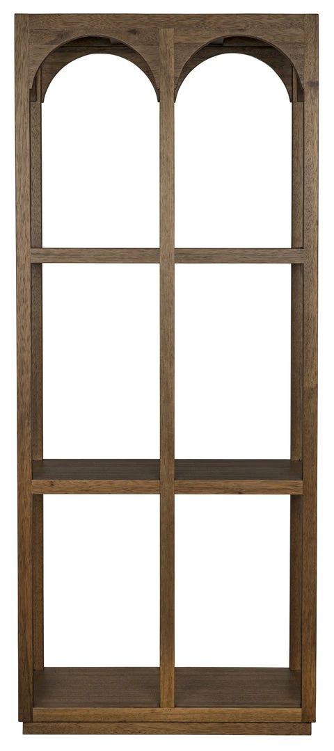 Stark cathedral like arches accent the top of this handcrafted walnut shelf. Finished in a dark walnut to accentuate the wood’s natural grain, the look is familiar but intriguing, with deep shelves for maximum display potential.