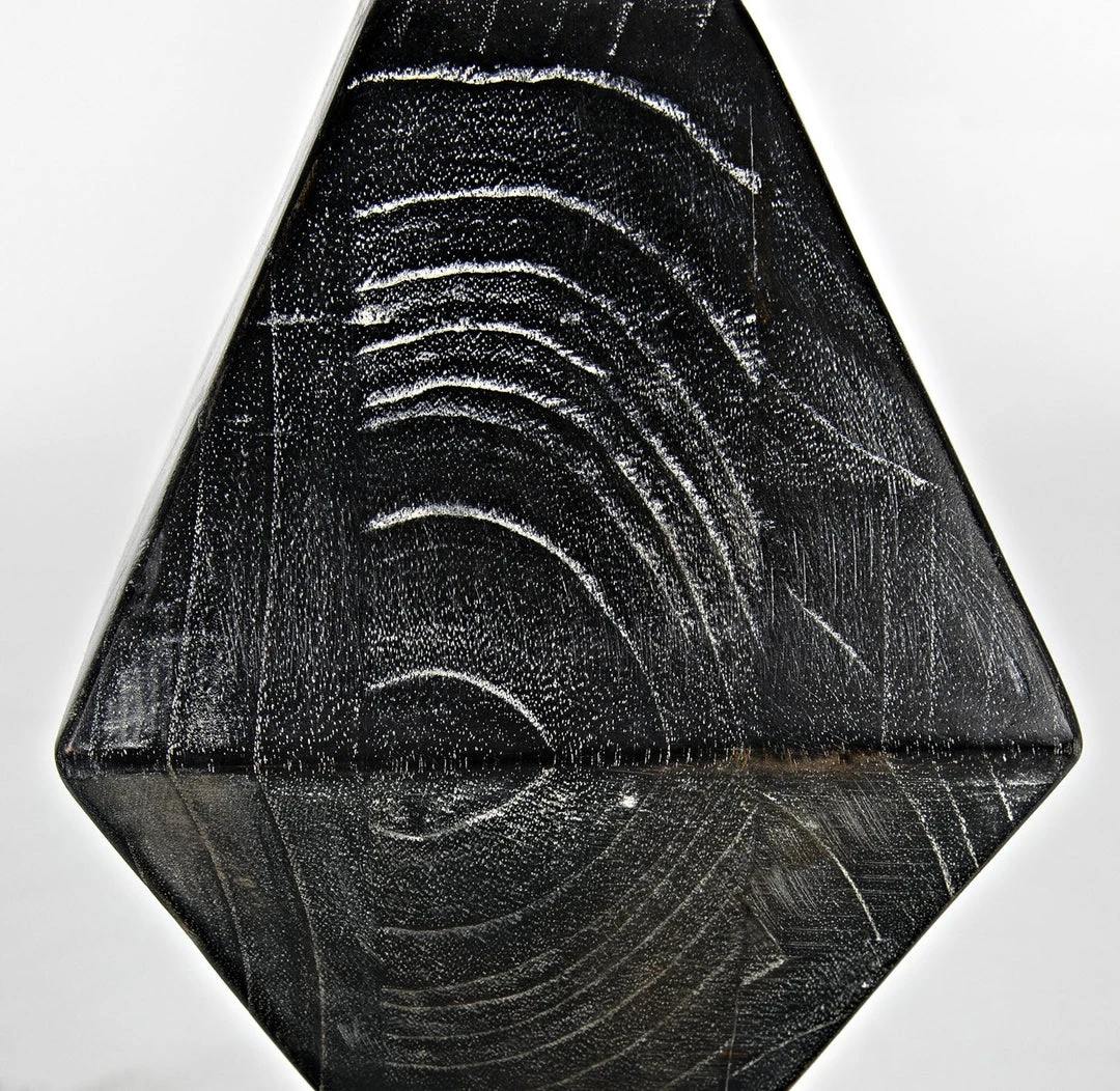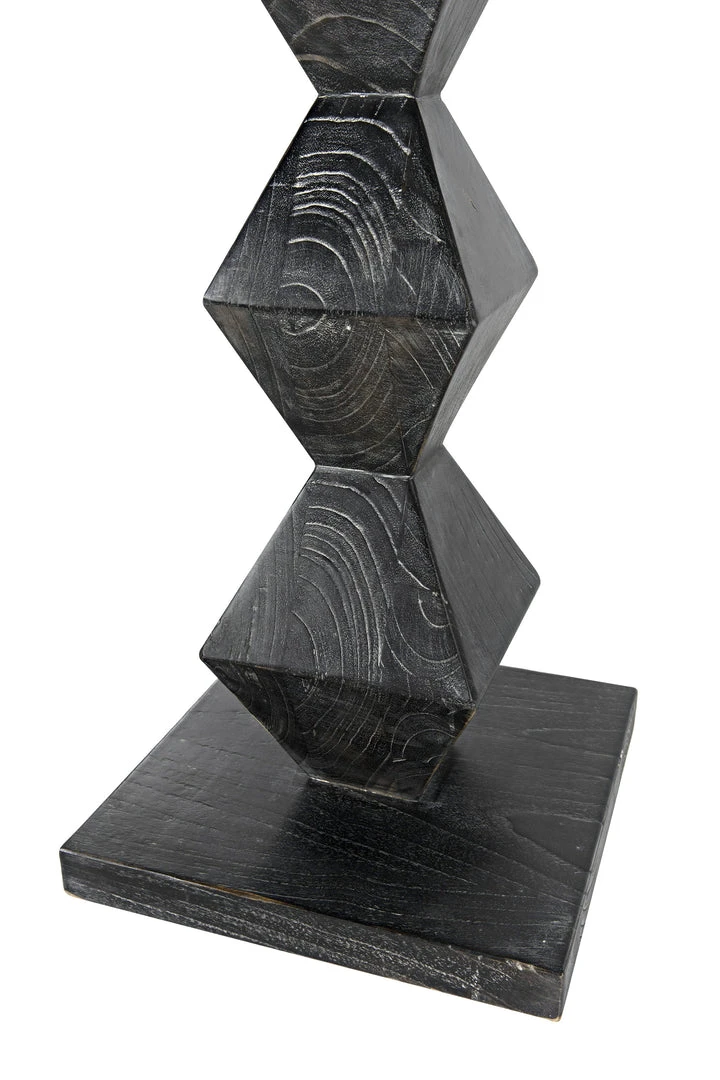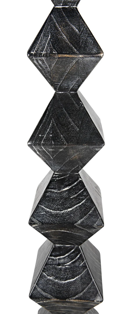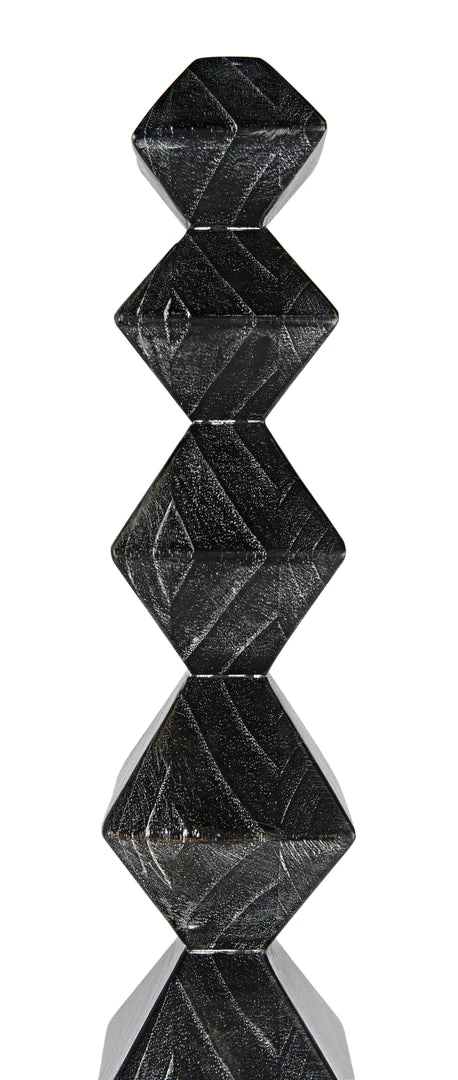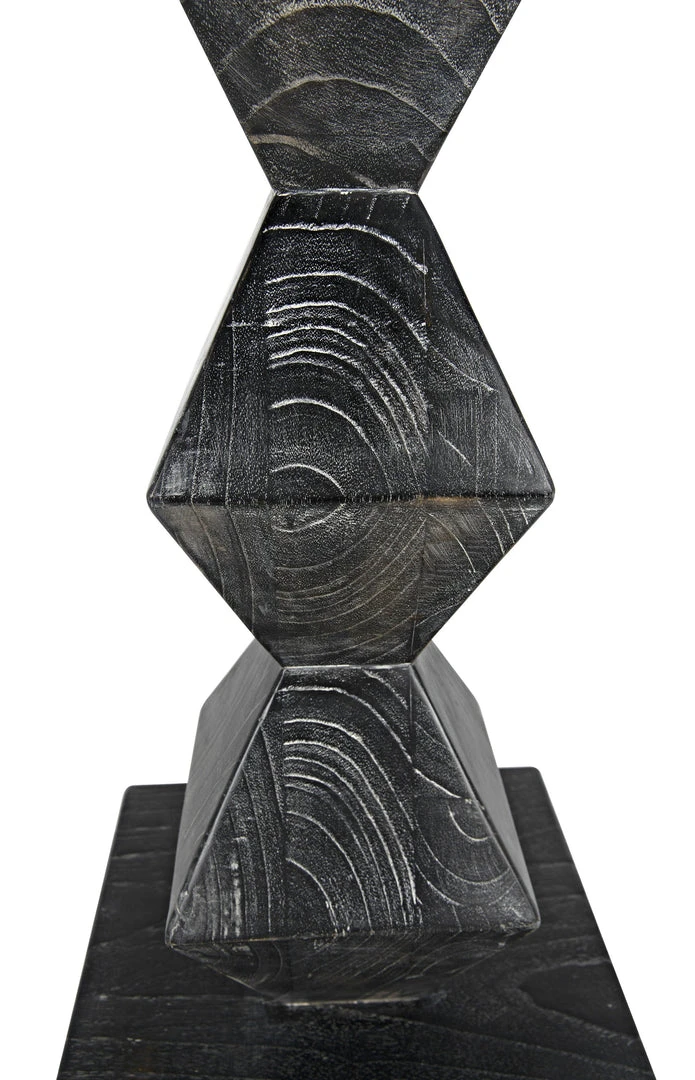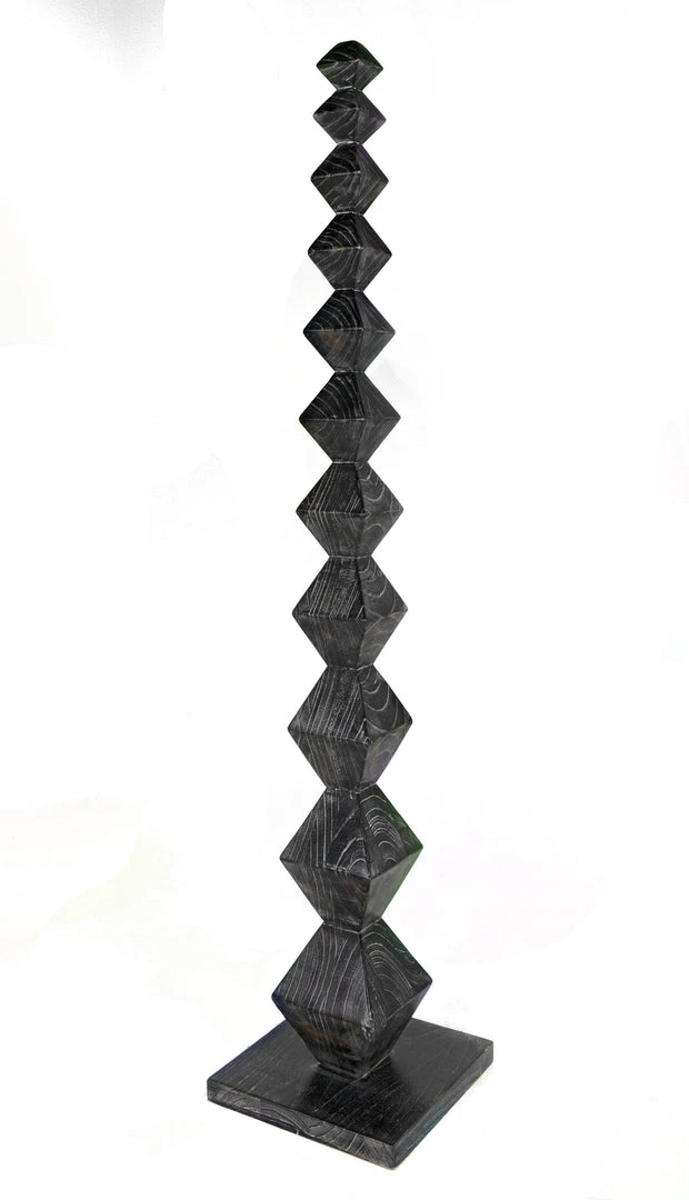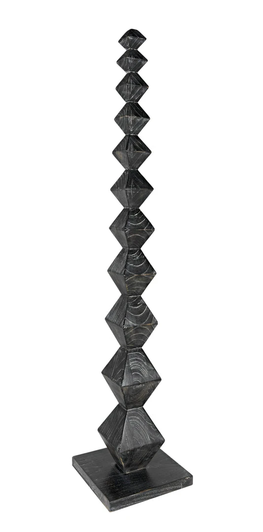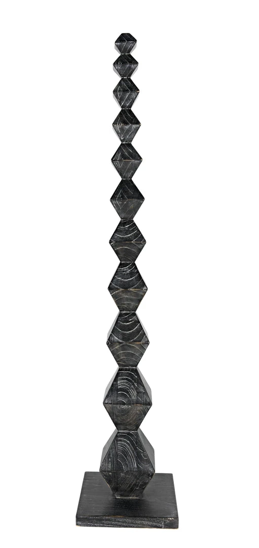 A totem for a modern age, this powerful sculpture was inspired by the work of the artist Brancusi. Our contemporary homage to his work is artisan crafted of mindi wood. We finish it with hand-applied layers of deep cinder-black that highlight the intrinsic beauty of the wood’s natural grain. It stands at over five and half feet in height, and is anchored by a simple square base in the same material.