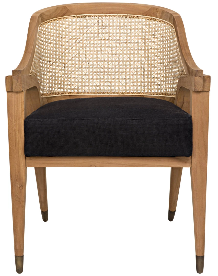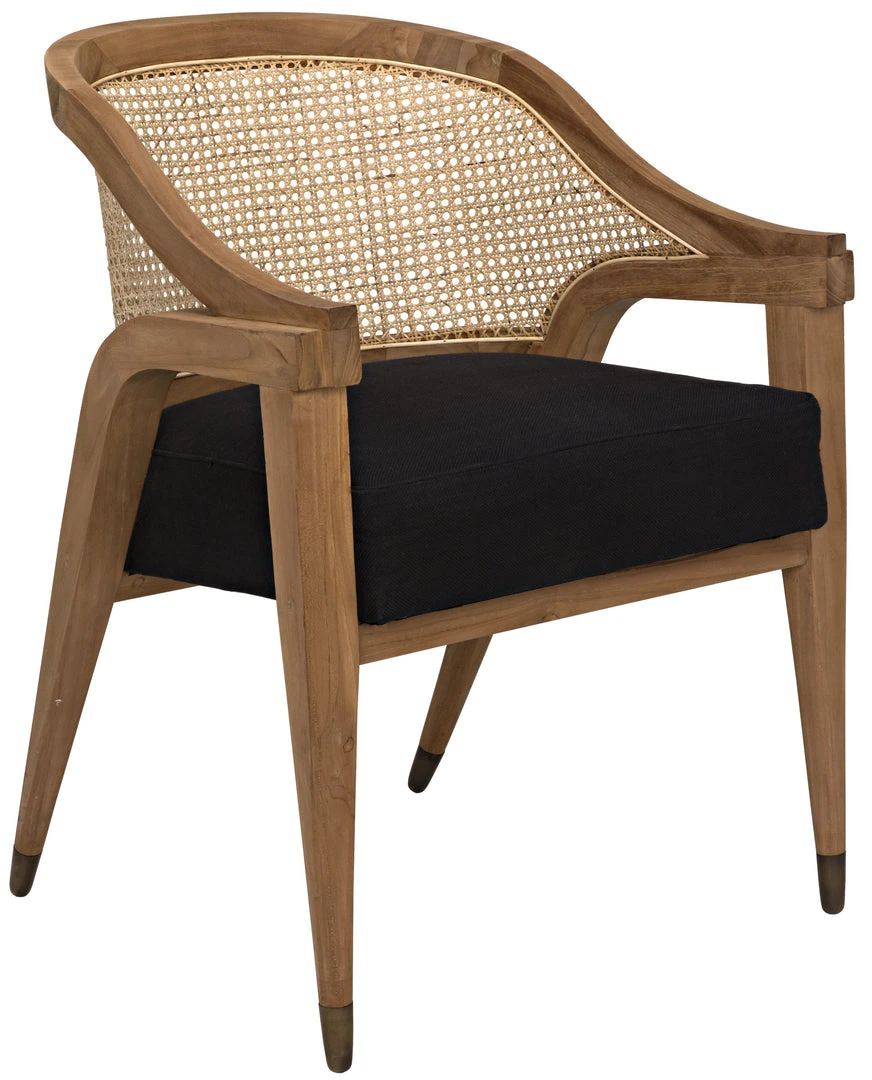 An extra thick black cotton seat and a supple caned back provide exquisite comfort, while natural teak, hand-carved into elegant and contemporary lines, provides style to this take on a classic”